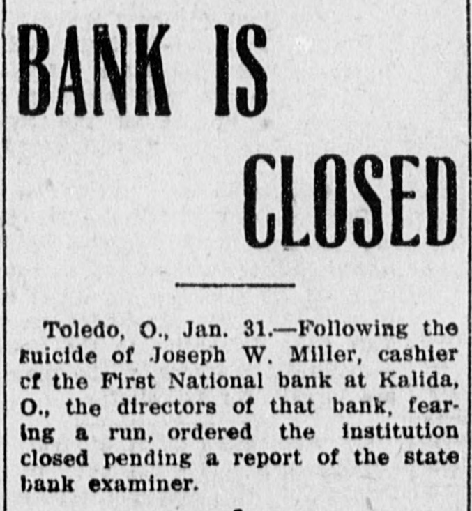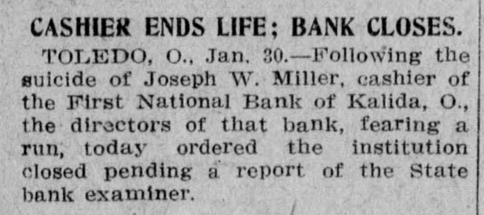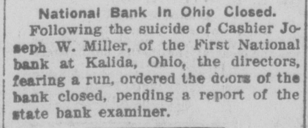 National Bank In Ohio Closed. Following the suicide of Cashier Joseph W. Miller, of the First National bank at Kalida, Ohio, the directors, fearing a run, ordered the doors of the bank closed, pending a report of the state bank examiner.