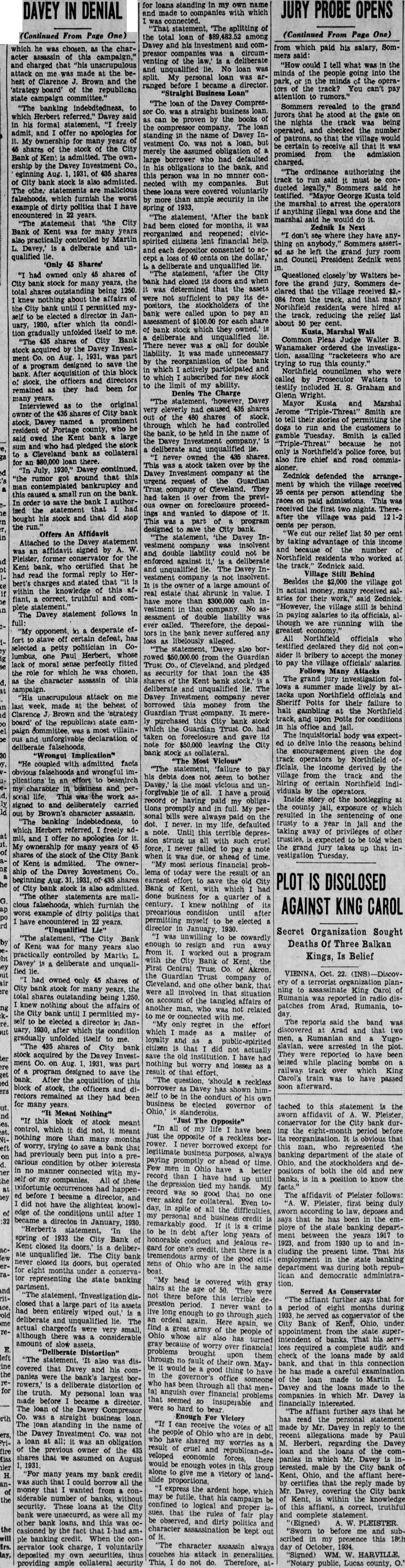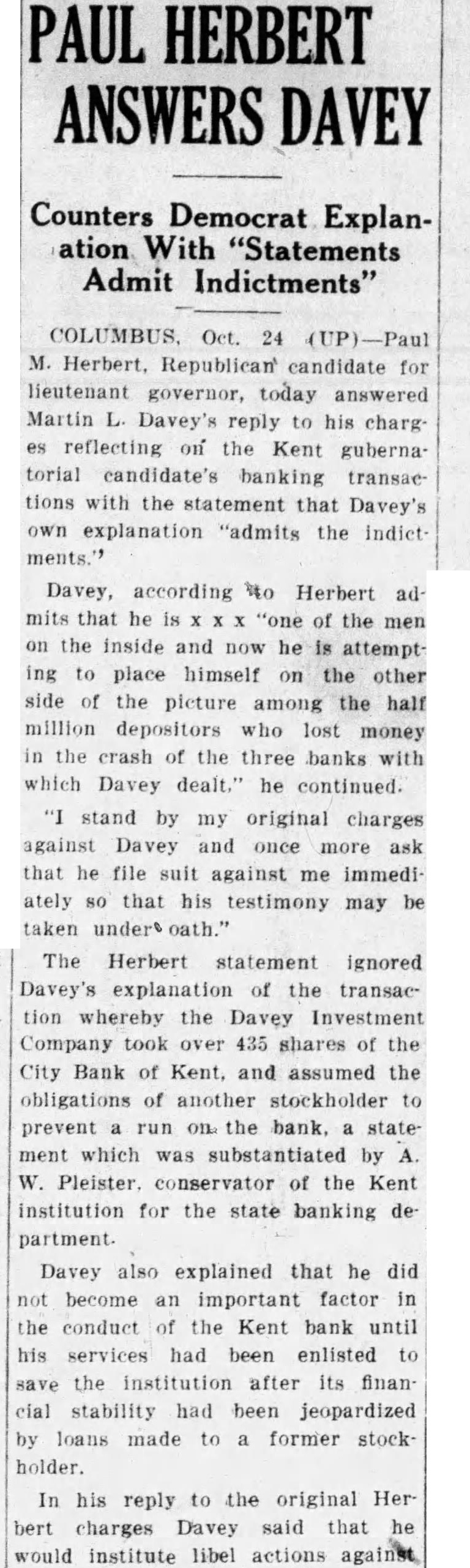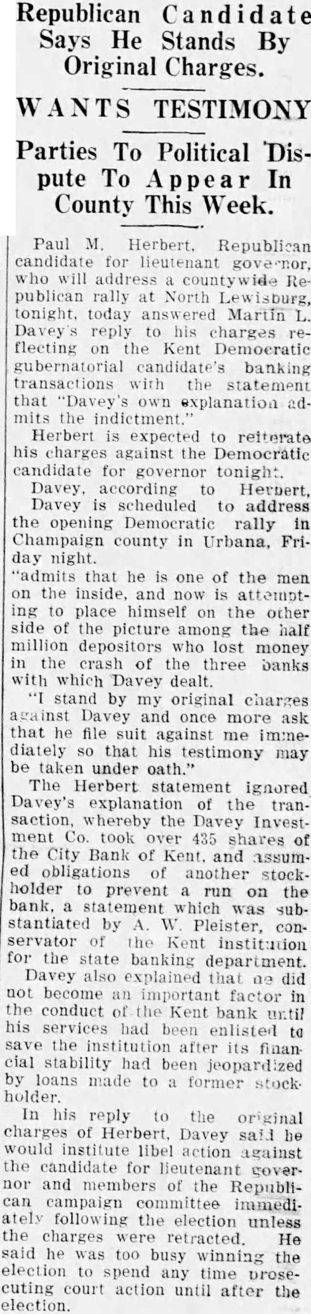 (Continued From Page One) he was chosen. as the charcampaign," and that "his the behest and the board' of the Davey said formal statement, admit, and for of the stock of the City Bank Ken: The the Co., 435 shares City bank also are malicious falsehoods, which furnish the example that statement that 'the City for many controlled Martin Davey,' delberate and qualified 'Only Shares' had owned 45 shares City bank stock for years, being knew nothing about affairs City bank permitted self elected director in 1930, after condiuary, tion unfolded 435 shares City by the Co. Aug. 1931, was part on this the officers and stock, been for Interviewed as to the original the City stock, named resident county, who owed the Kent bank said and who pledged the Cleveland collateral an $80,000 July, Davey "the rumor around that this got caused the the that his stock and that did the Offers An Affidavit "The statement, Davey InAttached the Davey statement signed and liability not for the Pleister, Kent certified that and The Davey read the formal reply to Hernot bert's that amount knowledge this real estate fiant, correct, truthful more than $300,000 statement. vestment company Davey statement follows sessment double liability called. Therefore, the deposi"My in desperate tors suffered any stave defeat, libelously alleged. politician Coalso borlumbus, one Paul Herbert, the lack perfectly fitted Trust and pledged the role for which he was that the of this the The unscrupulous attack Davey the money from the 'strategy Guardian company. board' state purchased City bank most the Guardian Trust Co. had taken on foreclosure gave unforgivable for $50,000 leaving the City deliberate falsehoods "Wrongul Implication" "He coupled admitted facts pay obvious wrongful bother plications an besmirch the and business and perforgivable record signed and deliberately carried My Brown's assassin. sonal paid the banking indebtedness, life, defaulted which Herbert freely this terrible depresand apologies for sion struck such ownership for years never failed note Bank ahead was due, The serious financial the Davey Co., were the earnest the old City City also Kent, which had other are for of clous falsehoods, furnish the century. nothing example dirty politics that precarious after have permitting myself elected years. "Unqualified "The City Bank cowardly for enough resign run also worked by Martin the City Bank Davey' deliberate and unqualiCentral Trust Co. fied Guardian Trust had owned only 45 shares of and other bank, that City for years, the were all situation shares the tangled affairs the affairs of related the City bank myelected regret in effort 1930, after which its matter itself to loyalty 435 shares City bank that actually acquired the Invest- old had ment Aug. was part nothing but worry and program designed to the that After the acquisition question, this 'should reckless of stock, the officers borrower Davey himrectors remained as they had been the conduct his for elected governor Meant Ohio, slanderous Nothing" block The Opposite" meant "In control, did not, meant have just the nothing than months reckless that except for had into put paying by other interests Few no manner better myrecord than or my companies. these the depression tied my had happenrecord before good no one became and ever not the all the edge the and credit 1930. crime the debt after long years spring the Bank and jealous for there unqualified The City the citiclosed doors, but of Ohio who are the same eight months representing the banking head covered with gray partment. this terrible closed pression its assets entirely wiped live deliberate and unqualified The ordeal again, actual find small, the people although considerable air also has turned amount because over financial 'Deliberate Distortion" brought upon them "The statement, dis- through fault own. Mayand his com- good have the panies the bank's largest someone has that menthe My personal loan was that seemed became The the Davey straight Enough Victory standing the the the people the Co. was not have shared my was obligation worries the result cruel previous owner the 435 that veloped economic shares assumed on August would enough votes this "For many years my bank victory landcould borrow money that wanted from express the ardent hope, which siderable of without campaign security. These the logical and proper my play other and was and dirty and the had be the conple "The character assassin always deposited his providing ample collateral This, do not do. Therefore, for loans in my own and to with which "The splitting of the total loan Davey and compressor was circumventing the deliberate loan was split. My personal ranged before became director. "Straight Business Loan" loan of the Davey Compresbusiness can proven the books of the company. The standing name Davey Co. was loan, merely the who had defaulted the and this was mnner my ample security in the spring 'After the bank had closed for reorganized lent financial and each consented cents on the dollar,' 'after the City had closed and when was determined that the assets not the upon pay each of bank which they There never was call for double liability. the which actively and which subscribed new the ability. Denies Charge statement, Davey cleverly caused 435 shares shares stock, had controlled held the name the Davey 435 shares. urgent request Guardian Trust company Cleveland. had taken from proceedings and wanted to dispose program the City tached this statement the sworn affidavit Pleister, conservator the City bank during period that and and the in position know the The affidavit Pleister follows: Pleister, being duly law, deposes that he has the the banking depart years 1923, 1930 and cluding present time. his employment banking department during repubdemocratic administra- Served As Conservator for Bank Ohio, appointment the intendent That his ices and loans made bank, and that this he made careful examination the made Martin Davey the