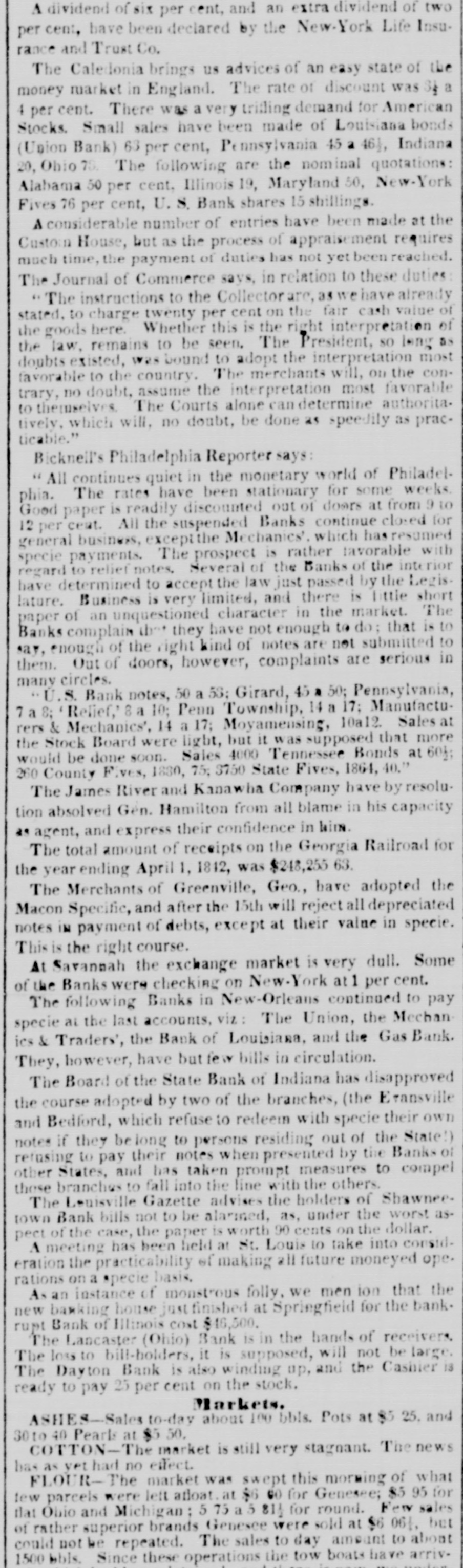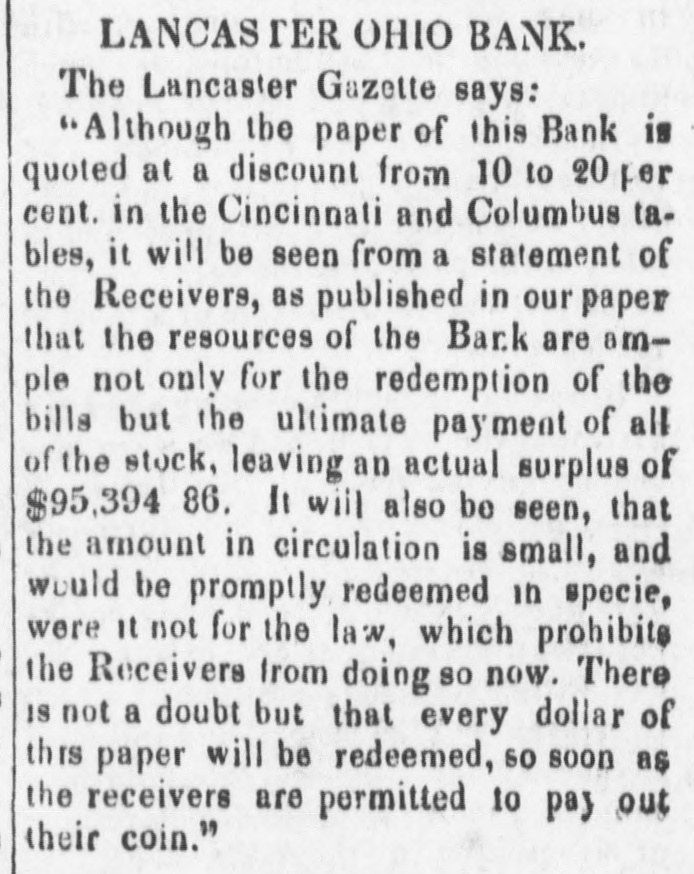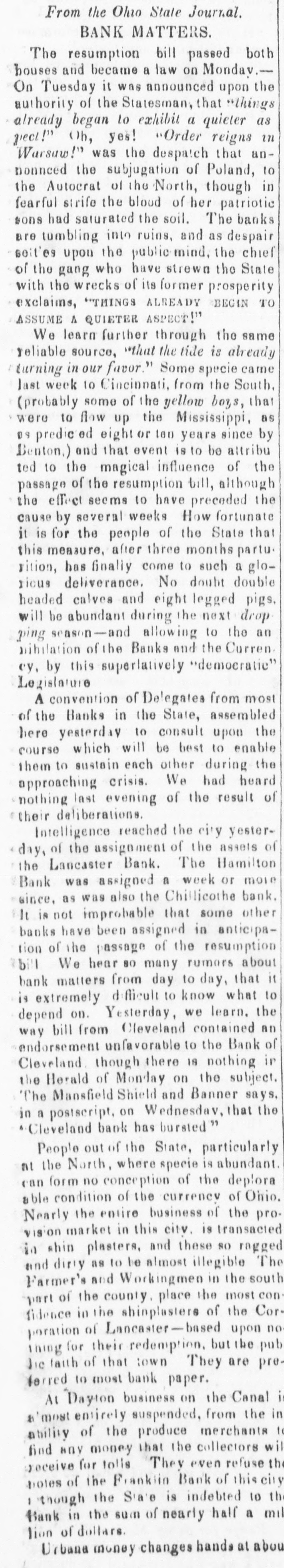 From the Ohio State Journal. BANK MATTERS. The resumption bill passed both houses and became a law on Monday.On Tuesday it was announced upon the authority of the Statesman, that things already began to exhibit a quieter as in pee!!" Oh, yes! "Order reigns was the anthe subjugation of the North, strife the blood of nonneed the fearful Warsaw!" Autocrat despatch of her though The Poland, that patriotic banks in to sons had saturated the soil. into ruins, and as despair the public mind, soit'es are tumbling upon the the State chief of the gang who have strewn with the wrecks of its former prosperity exclaims, **THINGS ALREADY BEEGIN TO ASSUME A QUIETER ASPECT!" We learn further through the same the the tide is already in our favor." Some turning reliable source, specie the South. came last week to Cincinnati, from (probably some of the yellow boys, that to flow up the Mississippi, as eight or ten years were 09 predicted since attribu by and that event is to be to the magical influence of the resumption the effect seems to have several weeks How Benton.) ted cause passage by bill, preceded fortunate although of that the the for the people of the after three has finaliy come to a deliverance. No calves and eight this ricus rition, it is measure, months doubt legged such State double partu. pigs, globe abundant during the next season-and allowing to of the Banks and ping headed will initiation the Curren the drop an cy, by this superlatively "democratic" Legislature A convention of Delegates from most of the Banks in the State, assembled the here yesterday to consult upon course which will be best to enable them to sustain each other during the approaching crisis. We had heard of nothing last evening of the result their deliberations. Intelligence reached the city yester- of day, of the assignment of the assets the Lancaster Bank. The Hamilton Bank was assigned a week or more as was also the Chillicothe bank. It not improbable that some have been assigned the passage of the bill We hear so many rumors it since, tion banks is of in resumption anticipa- that other about matters from day to day, difficult to know to is on. Yesterday, we from Cleveland an depend bank way extremely bill contained the learn. what Bank the endorsement unfavorable to of though there 18 of Monday on Cleveland the Herald the nothing subject. ir The Mansfield Shield and Banner says. in a postscript, on Wednesdav, that the Cleveland bank has bursted" People out of the State, particularly North, where specie is abundant. at no conception of the of the currency the entire business procan able Nearly the form condition of transacted deplora of the Ohio. market in this city. is plasters, and so as to be almost in vision and shin dirly these illegible the ragged south The Farmer's and Workingmen in part of the county. place the most con in the shinplasters of the Corof Idence poration Lancaster-based upon the pub no for their redemption. but Jie fining faith of that town They are preforred to most bank paper. At Dayton business on the Canal i s'mest emirely suspended, from the in ability of the produce merchants 1 find any money that the collectors will receive for tolls They even refuse the notes of the Franklin Bank of hiscity though the Sta'e is indebted 10 th Bank in the sum of nearly half a mil lion of dollars. Urbana money changes hands at abou