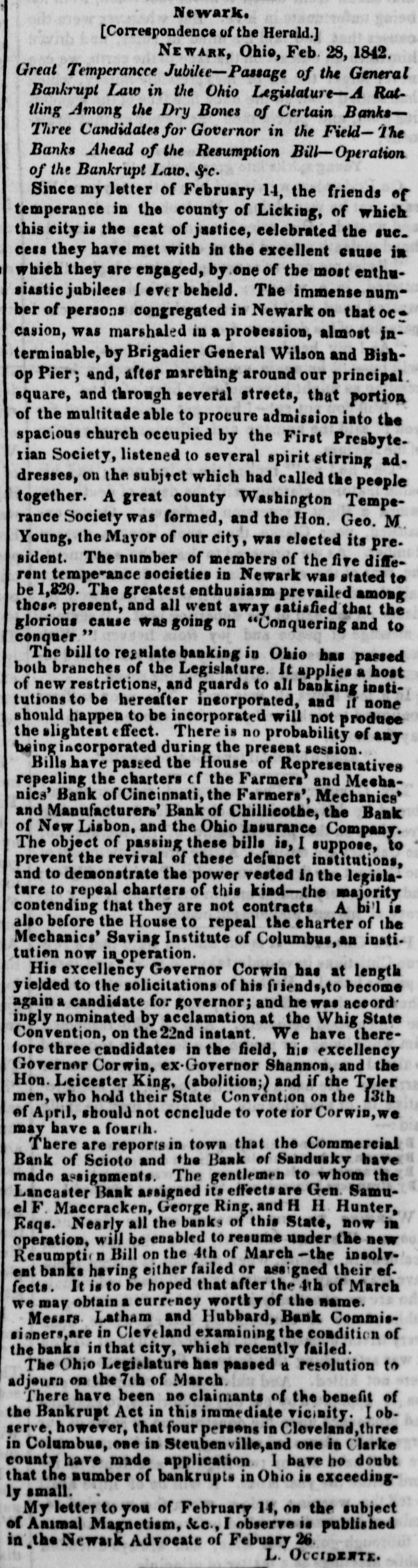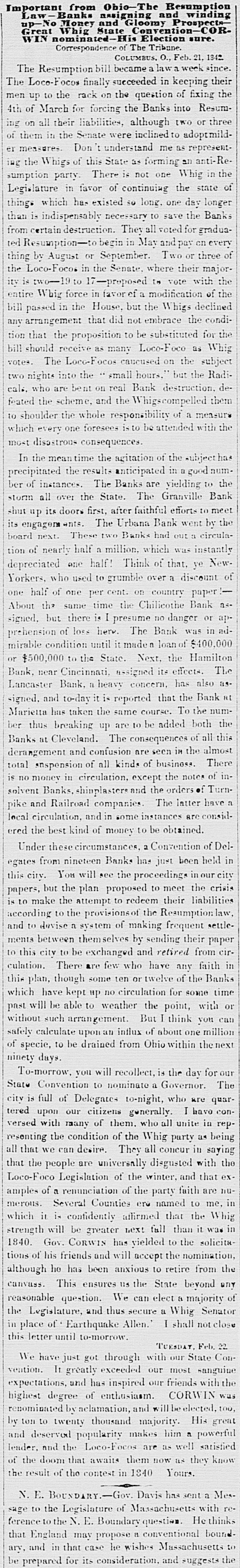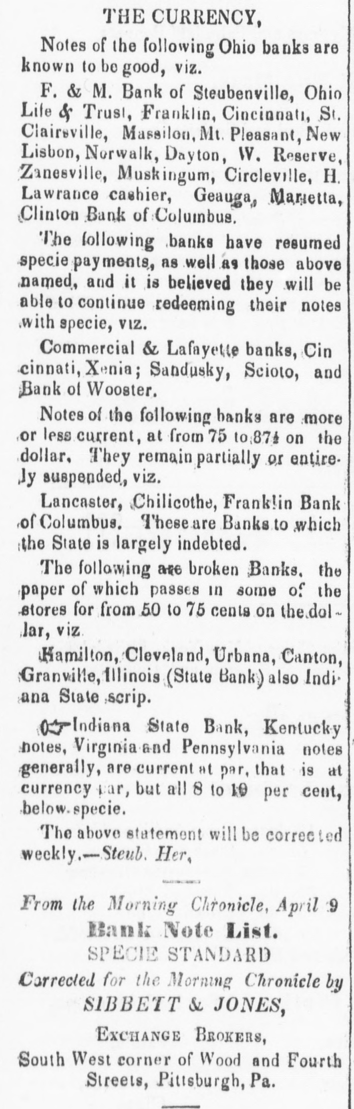 From the Ohio State Journal. BANK MATTERS. The resumption bill passed both houses and became a law on Monday.On Tuesday it was announced upon the authority of the Statesman, that things already began to exhibit a quieter as in pee!!" Oh, yes! "Order reigns was the anthe subjugation of the North, strife the blood of nonneed the fearful Warsaw!" Autocrat despatch of her though The Poland, that patriotic banks in to sons had saturated the soil. into ruins, and as despair the public mind, soit'es are tumbling upon the the State chief of the gang who have strewn with the wrecks of its former prosperity exclaims, **THINGS ALREADY BEEGIN TO ASSUME A QUIETER ASPECT!" We learn further through the same the the tide is already in our favor." Some turning reliable source, specie the South. came last week to Cincinnati, from (probably some of the yellow boys, that to flow up the Mississippi, as eight or ten years were 09 predicted since attribu by and that event is to be to the magical influence of the resumption the effect seems to have several weeks How Benton.) ted cause passage by bill, preceded fortunate although of that the the for the people of the after three has finaliy come to a deliverance. No calves and eight this ricus rition, it is measure, months doubt legged such State double partu. pigs, globe abundant during the next season-and allowing to of the Banks and ping headed will initiation the Curren the drop an cy, by this superlatively "democratic" Legislature A convention of Delegates from most of the Banks in the State, assembled the here yesterday to consult upon course which will be best to enable them to sustain each other during the approaching crisis. We had heard of nothing last evening of the result their deliberations. Intelligence reached the city yester- of day, of the assignment of the assets the Lancaster Bank. The Hamilton Bank was assigned a week or more as was also the Chillicothe bank. It not improbable that some have been assigned the passage of the bill We hear so many rumors it since, tion banks is of in resumption anticipa- that other about matters from day to day, difficult to know to is on. Yesterday, we from Cleveland an depend bank way extremely bill contained the learn. what Bank the endorsement unfavorable to of though there 18 of Monday on Cleveland the Herald the nothing subject. ir The Mansfield Shield and Banner says. in a postscript, on Wednesdav, that the Cleveland bank has bursted" People out of the State, particularly North, where specie is abundant. at no conception of the of the currency the entire business procan able Nearly the form condition of transacted deplora of the Ohio. market in this city. is plasters, and so as to be almost in vision and shin dirly these illegible the ragged south The Farmer's and Workingmen in part of the county. place the most con in the shinplasters of the Corof Idence poration Lancaster-based upon the pub no for their redemption. but Jie fining faith of that town They are preforred to most bank paper. At Dayton business on the Canal i s'mest emirely suspended, from the in ability of the produce merchants 1 find any money that the collectors will receive for tolls They even refuse the notes of the Franklin Bank of hiscity though the Sta'e is indebted 10 th Bank in the sum of nearly half a mil lion of dollars. Urbana money changes hands at abou