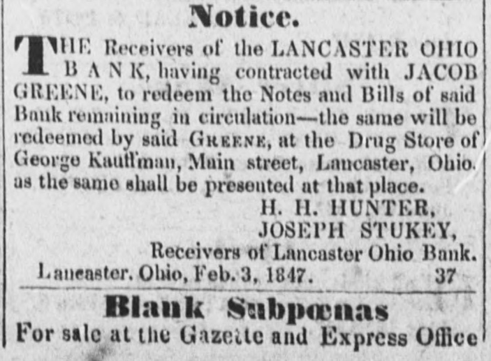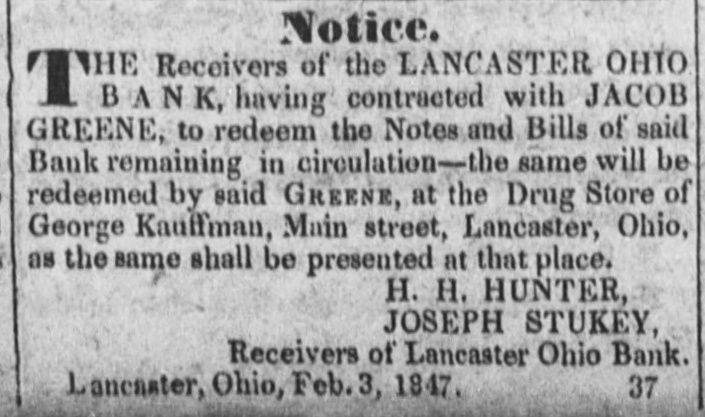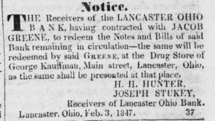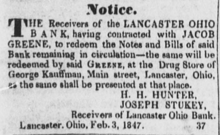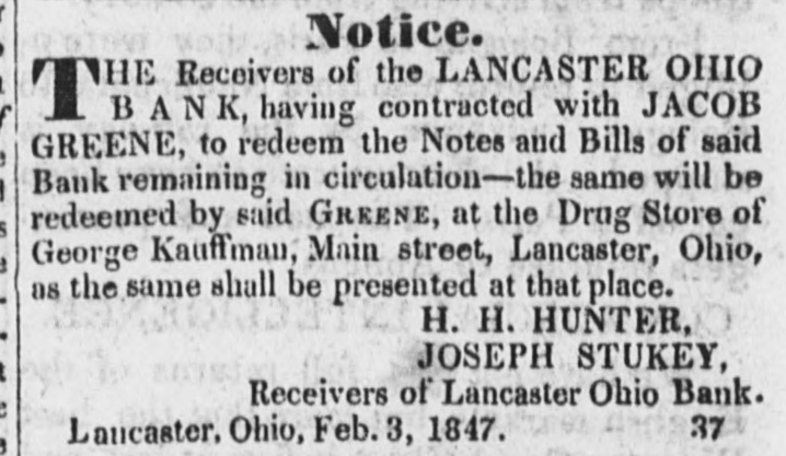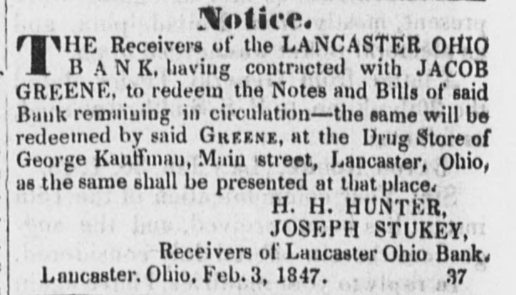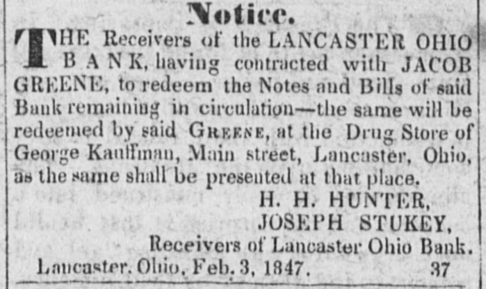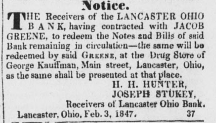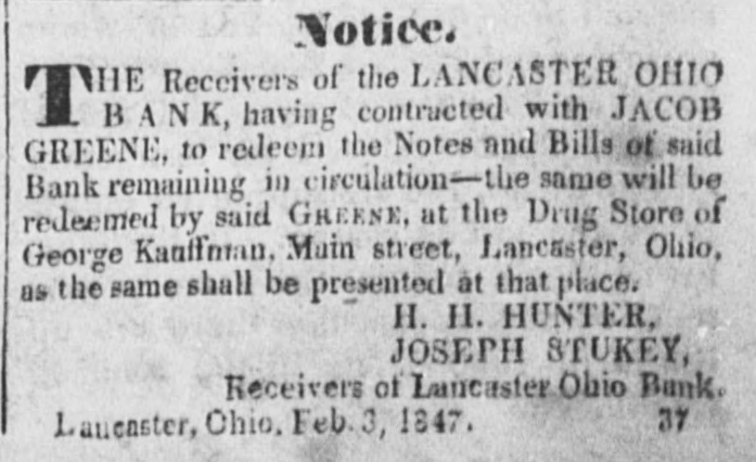 Notice. Receivers of the LANCASTER OHIO THE A N K, having contracted with JACOB GREENE, to redeem the Notes and Bills of said Bank remaining in circulation-the same will be redeemed by said GREENE, at the Drug Store of George Kauffman, Main street, Lancaster, Ohio, as the same shall be presented at that place. H. H. HUNTER, JOSEPH STUKEY, Receivers of Lancaster Ohio Bank. 37 Lancaster, Ohio, Feb. 3, 1847.