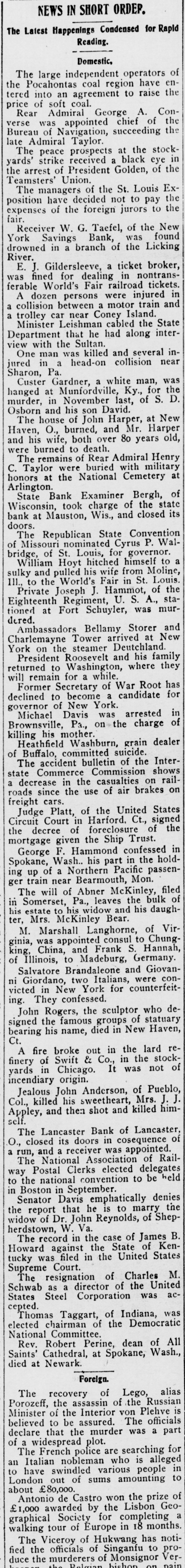 NEWS IN SHORT ORDEP. The Latest Happenings Condensed for Rapid Reading. Domestic, The large independent operators of the Pocahontas coal region have entered into an agreement to raise the price of soft coal. Rear Admiral George A. Converse was appointed chief of the Bureau of Navigation, succeeding the late Admiral Taylor. The peace prospects at the stockyards' strike received a black eye in the arrest of President Golden, of the Teamsters' Union. The managers of the St. Louis Exposition have decided not to pay the expenses of the foreign jurors to the fair. Receiver W. G. Taefel, of the New York Savings Bank, was found drowned in a branch of the Licking River. E. J. Gildersleeve, a ticket broker, was fined for dealing in nontransferable World's Fair railroad tickets. A dozen persons were injured in a collision between a motor train and a trolley car near Coney Island. Minister Leishman cabled the State Department that he had along interview with the Sultan. One man was killed and several injured in a head-on collision near Sharon, Pa. Custer Gardner, a white man, was hanged at Munfordville, Ky., for the murder, in November last, of S. D. Osborn and his son David. The house of John Harper, at New Haven, O., burned, and Mr. Harper and his wife, both over 80 years old, were burned to death. The remains of Rear Admiral Henry C. Taylor were buried with military honors at the National Cemetery at Arlington. State Bank Examiner Bergh, of Wisconsin, took charge of the state bank at Mauston, Wis., and closed its doors. The Republican State Convention of Missouri nominated Cyrus P. Walbridge, of St. Louis, for governor. a William Hoyt hitched himself to sulky and pulled his wife from Moline, III., to the World's Fair in St. Louis. Private Joseph J. Hammot, of the Eighteenth Regiment, U. S. A., stationed at Fort Schuyler, was murdered. Ambassadors Bellamy Storer and Charlemayne Tower arrived at New York on the steamer Deutchland. President Roosevelt and his family returned to Washington, where they will remain for a while. Former Secretary of War Root has declined to become a candidate for governor of New York. Michael Davis was arrested in Brownsville, Pa., on the charge of killing his mother. Heathfield Washburn, grain dealer of Buffalo, committed suicide. The accident bulletin of the Interstate Commerce Commission shows a decrease in the casualties on railroads since the use of air brakes on freight cars. Judge Platt, of the United States Circuit Court in Harford. Ct., signed the decree of foreclosure of the mortgage given the Ship Trust. George F. Hammond confessed in Spokane, Wash.. his part in the holding up of a Northern Pacific passenger train near Bearmouth, Mon. The will of Abner McKinley, filed in Somerset, Pa., leaves the bulk of his estate to his widow and his daughter, Mrs. McKinley Bear. M. Marshall Langhorne, of Virginia, was appointed consul to Chungking, China, and Frank S. Hannah, of Illinois, to Madeburg, Germany. Salvatore Brandaleone and Giovanni Giordano, two Italians, were convicted in New York for counterfeiting. They confessed. John Rogers, the sculptor who designed the famous groups of statuary bearing his name, died in New Haven, Ct. A fire broke out in the lard refinery of Swift & Co., in the stockyards in Chicago. It was not of incendiary origin. Jealous John Anderson, of Pueblo, Col., killed his sweetheart, Mrs. J. J. Appley, and then shot and killed himself. The Lancaster Bank of Lancaster, O., closed its doors in cosequence of a run, and a receiver was appointed. The National Association of Railway Postal Clerks elected delegates to the national convention to be held in Boston in September. Senator Davis emphatically denies the report that he is to marry the widow of Dr. John Reynolds, of Shepherdstown, W. Va. The record in the case of James B. Howard against the State of Kentucky was filed in the United States Supreme Court. The resignation of Charles M. Schwab as a director of the United States Steel Corporation was accepted. Thomas Taggart, of Indiana, was elected chairman of the Democratic National Committee. Rev. Robert Perine, dean of All Saints' Cathedral, at Spokane, Wash., died at Newark. Foreign. The recovery of Lego, alias Porozeff, the assassin of the Russian Minister of the Interior von Plehve is believed to be assured. The officials declare that the murder was a part