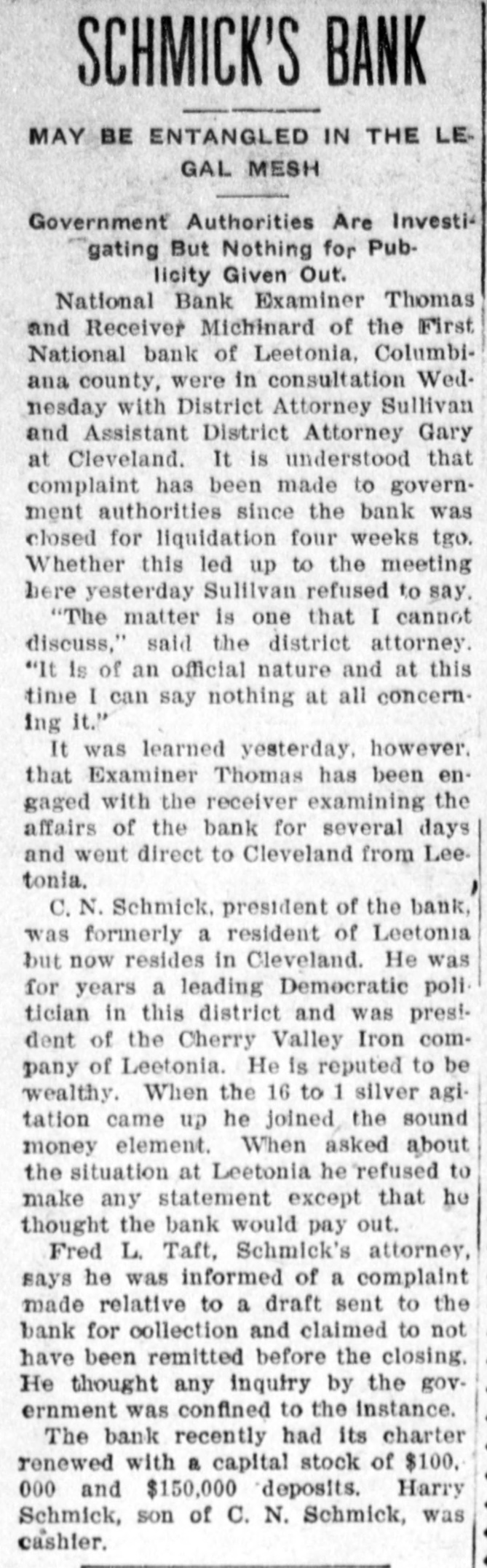 SCHMICK'S BANK MAY BE ENTANGLED IN THE LEGAL MESH Government Authorities Are Investigating But Nothing for Publicity Given Out. National Bank Examiner Thomas and Receiver Michinard of the First National bank of Leetonia, Columbiana county, were in consultation Wednesday with District Attorney Sullivan and Assistant District Attorney Gary at Cleveland. It is understood that complaint has been made to government authorities since the bank was closed for liquidation four weeks tgo. Whether this led up to the meeting here yesterday Sulilvan refused to say. "The matter is one that I cannot discuss," said the district attorney. "It is of an official nature and at this time I can say nothing at all concerning it." It was learned yesterday, however. that Examiner Thomas has been engaged with the receiver examining the affairs of the bank for several days and went direct to Cleveland from Leetonia. C. N. Schmick, president of the bank, was formerly a resident of Leetonia but now resides in Cleveland. He was for years a leading Democratic politician in this district and was president of the Cherry Valley Iron company of Leetonia. He is reputed to be wealthy. When the 16 to 1 silver agitation came up he joined the sound money element. When asked about the situation at Leetonia he refused to make any statement except that he thought the bank would pay out. Fred L. Taft, Schmick's attorney, says he was informed of a complaint made relative to a draft sent to the bank for collection and claimed to not have been remitted before the closing. He thought any inquiry by the government was confined to the instance. The bank recently had its charter renewed with a capital stock of $100. 000 and $150,000 deposits. Harry Schmick, son of C. N. Schmick, was cashier.