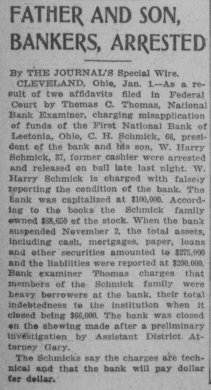 FATHER AND SON, BANKERS, ARRESTED By THE JOURNAL'S Special Wire. CLEVELAND, Ohie, Jan. 1.-As a result of two affidavits filed in Federal Court by Thomas C. Thomas, National Bank Examiner, charging misapplication of funds of the First National Bank of Leetonia, Ohio, C. H. Schmick, 66, president of the bank and his son, W. Harry Schmick, 37, former cashier were arrested and released on bail late last night. W. Harry Schmick is charged with falsely reporting the condition of the bank. The bank was capitalized at $100,000. According to the books the Schmick family owned $88,650 of the stock. When the bank suspended November 2, the total assets, including cash, mortgages, paper, loans and other securities amounted to $275,000 and the liabilities were reported at $200,000. Bank examiner Thomas charges that members of the Schmick family were heavy borrowers at the bank, their total indebtedness to the institution when it closed being $66,000. The bank was closed on the shewing made after a preliminary investigation by Assistant District Attorney Gary. The Schmicks say the charges are technical and that the bank will pay dollar for dellar.