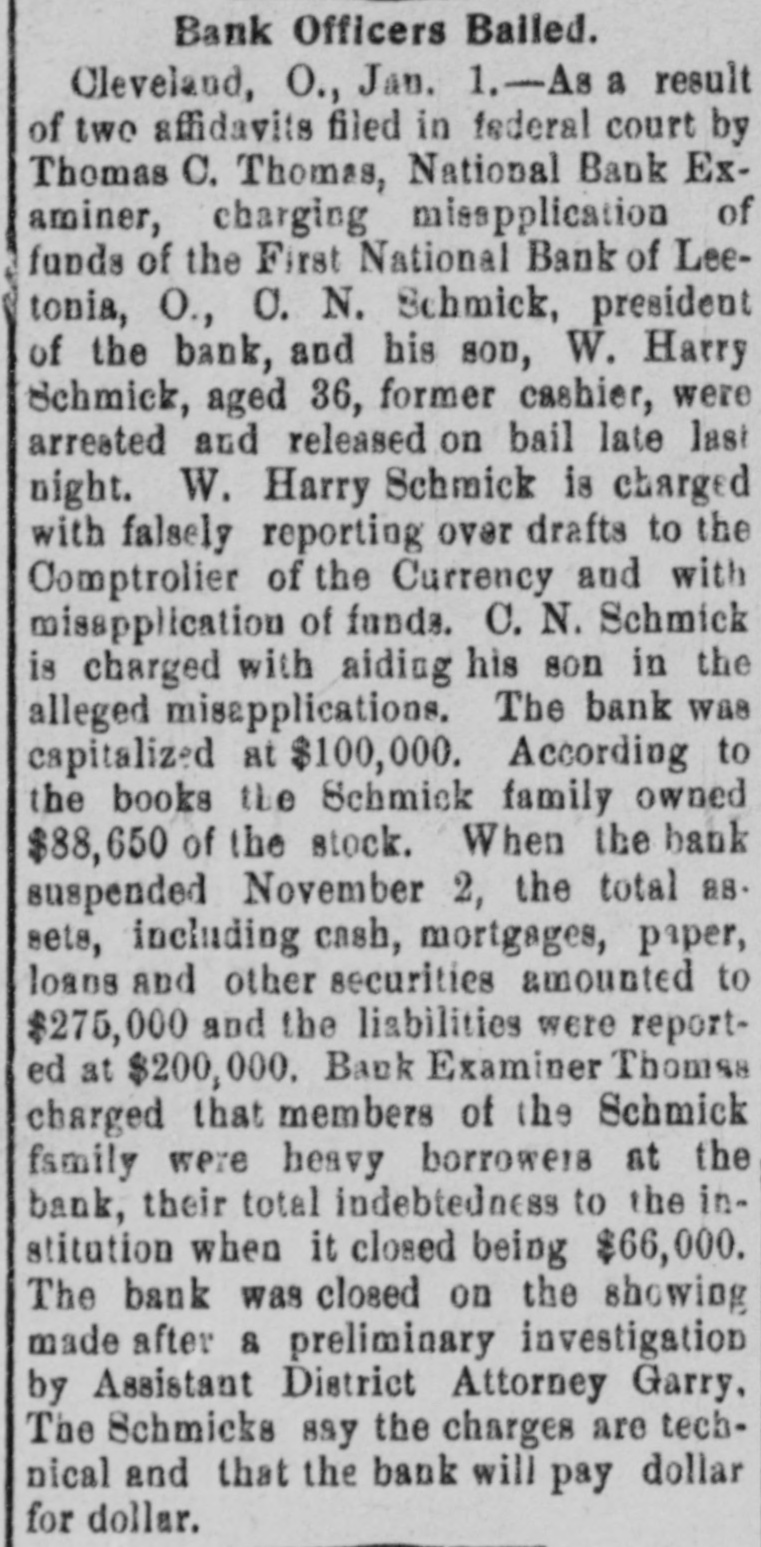 As a result of two affidavits filed in Federal Court by Thomas C. Thomas, National Bank Examiner, charging misapplication of funds of the First National Bank of Leetonia, Ohio, C. H. Schmick...and his son...were arrested and released on bail late last night.