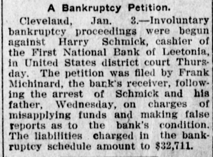 A Bankruptcy Petition. Cleveland, Jan. 3.-Involuntary bankruptcy proceedings were begun against Harry Schmick, cashier of the First National Bank of Leetonia, in United States district court Thursday. The petition was filed by Frank Michinard, the bank's receiver, following the arrest of Schmick and his father, Wednesday, on charges of misapplying funds and making false reports as to the bank's condition. The liabilities charged in the bankruptcy schedule amount to $32,711.