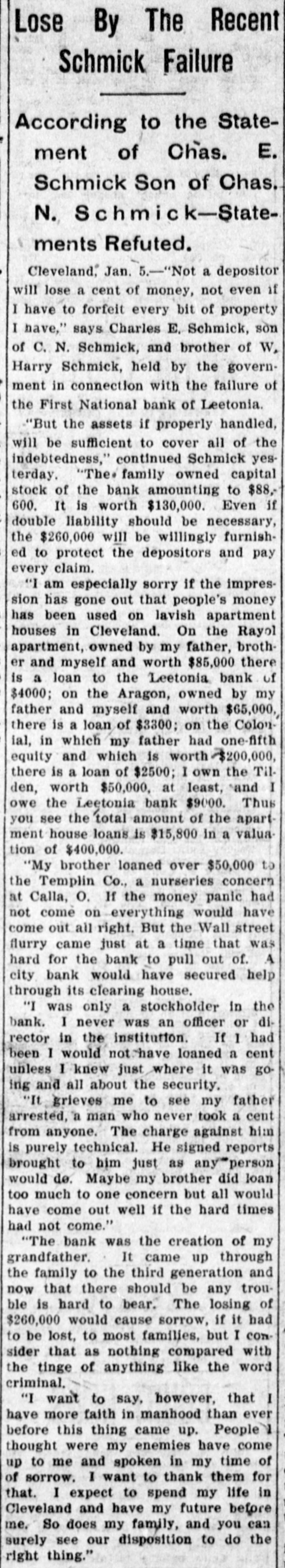 Lose By The Recent Schmick Failure According to the Statement of Chas. E. Schmick Son of Chas. N. Schmick-Statements Refuted. Cleveland, Jan. 5.-"Not a depositor will lose a cent of money, not even if I have to forfeit every bit of property I have," says Charles E. Schmick, son of C. N. Schmick, and brother of W. Harry Schmick, held by the government in connection with the failure of the First National bank of Leetonia. "But the assets if properly handled, will be sufficient to cover all of the indebtedness," continued Schmick yesterday. "The family owned capital stock of the bank amounting to $88,600. It is worth $130,000. Even if double liability should be necessary, the $260,000 will be willingly furnished to protect the depositors and pay every claim. "I am especially sorry if the impression has gone out that people's money has been used on lavish apartment houses in Cleveland. On the Rayol apartment, owned by my father, brother and myself and worth $85,000 there is a loan to the Leetonia bank of $4000; on the Aragon, owned by my father and myself and worth $65,000, there is a loan of $3300; on the Colonial, in which my father had one-fifth equity and which is worth $200,000, there is a loan of $2500; I own the Tilden, worth $50,000, at least, and I owe the Leetonia bank $9000. Thus you see the total amount of the apartment house loans is $15,800 in a valuation of $400,000. "My brother loaned over $50,000 to the Templin Co., a nurseries concern at Calla, O. If the money panic had not come on everything would have come out all right. But the Wall street flurry came just at a time that was hard for the bank to pull out of. A city bank would have secured help through its clearing house. "I was only a stockholder in the bank. I never was an officer or director in the institution. If I had been I would not have loaned a cent unless I knew just where it was going and all about the security. "It grieves me to see my father arrested, a man who never took a cent from anyone. The charge against him is purely technical. He signed reports brought to him just as any person would de. Maybe my brother did loan too much to one concern but all would have come out well if the hard times had not come." "The bank was the creation of my grandfather. It came up through the family to the third generation and now that there should be any trouble is hard to bear. The losing of $260,000 would cause sorrow, if it had to be lost, to most families, but I consider that as nothing compared with the tinge of anything like the word criminal. "I want to say, however, that I have more faith in manhood than ever before this thing came up. People thought were my enemies have come up to me and spoken in my time of of sorrow. I want to thank them for that. I expect to spend my life in Cleveland and have my future before me. So does my family, and you can surely see our disposition to do the right thing."