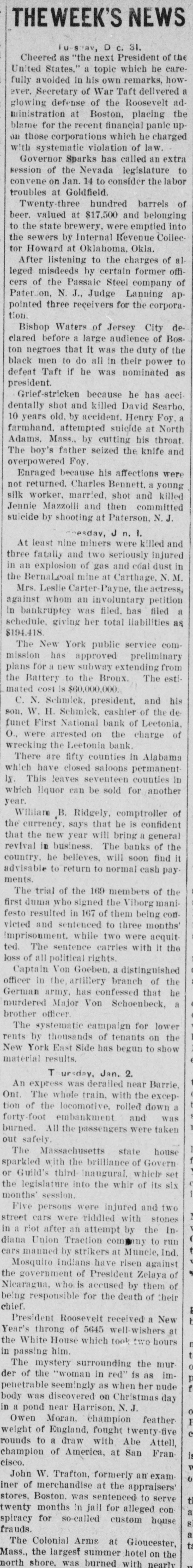 THEWEEK'S NEWS '18 10 0 'mens-nj Cheered as "the next President of United States." a topic which he care fully avoided in his own remarks, how ever. Secretary of War Taft delivered glowing defense of the Roosevelt ministration at Boston, placing the blame for the recent financial panic on those corporations which he charged with systematic violation of law. Governor Sparks has called an extra session of the Nevada legislature convene on Jan. 14 to consider the labor troubles at Goldfield. Twenty-three hundred barrels of beer. valued at $17,500 and belonging to the state brewery, were emptied into the sewers by Internal Revenue Collec tor Howard at Oklahoma, Okla. After listening to the charges of leged misdeeds by certain former cers of the Passaic Steel company of Paterson. N. J., Judge Lanning appointed three receivers for the corporation. Bishop Waters of Jersey City clared before a large audience of Boston negroes that it was the duty of the black men to do all in their power defeat Taft if he was nominated president. Grief-stricken because he has accidentally shot and killed David Scarbo. 10 years old. by accident. Henry Foy, farmhand. attempted suicide at North Adams. Mass., by cutting his throat. The boy's father seized the knife and overpowered Foy. Enraged because his affections not returned. Charles Bennett. a young silk worker. married, shot and killed Jennie Mazzolli and then committed suicide by shooting at Paterson. N.J. 1 'u r At least nine miners were killed and three fatally and two seriously injured in an explosion of gas and coal dust in the Bernal.coal mine at Carthage. N. M. Mrs. Leslie Carter-Payne, the actress, against whom an involuntary petition in bankruptcy was filed. has filed a schedule, giving her total liabilities as SIFTGIS The New York public service commission has approved preliminary plans for a new subway extending from the Battery to the Bronx. The esti000'000'09$ S| $800 persu C. N. Schmick. president, and his son. W. H. Schmick, cashier of the defunct First National bank of Leetonia, O., were arrested on the charge of wrecking the Leetonia bank. There are fifty counties in Alabama which have closed saloons permanently. This leaves seventeen counties in which liquor can be sold for another year. William B. B. Ridgely, comptroller of the currency, says that he is confident that the new year will bring a general revival in business. The banks of the country. he believes, will soon find it advisable to return to normal cash payments. The trial of the 169 members of the first duma who signed the Viborg manifesto resulted in 167 of them being convicted and sentenced to three months'