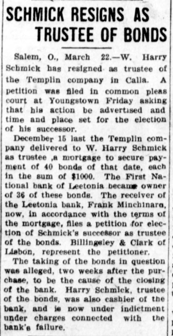 SCHMICK RESIGNS AS TRUSTEE OF BONDS Salem, O., March 22.-W. Harry Schmick has resigned as trustee of the Templin company in Calla. A petition was filed in common pleas court at Youngstown Friday asking that his action be advertised and time and place set for the election of his successor. December 15 last the Templin company delivered to W. Harry Schmick as trustee ,a mortgage to secure payment of 40 bonds of that date, each in the sum of $1000. The First National bank of Leetonia became owner of 36 of these bonds. The receiver of the Leetonia bank, Frank Minchinara, now, in accordance with the terms of the mortgage, files a petition for election of Schmick's successor as trustee of the bonds. Billingsley & Clark of Lisbon, represent the petitioner. The taking of the bonds in question was alleged, two weeks after the purchase, to be the cause of the closing of the bank. Harry Schmick, trustee of the bonds, was also cashier of the bank, and is now under indictment under charges connected with the bank's failure.