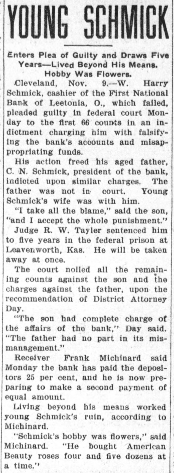 YOUNG SCHMICK Enters Plea of Guilty and Draws Five Years-Lived Beyond His Means. Hobby Was Flowers. Cleveland, Nov. 9.-W. Harry Schmick, cashier of the First National Bank of Leetonia, O., which failed, pleaded guilty in federal court Monday to the first 66 counts in an indictment charging him with falsifying the bank's accounts and misappropriating funds. His action freed his aged father, C. N. Schmick, president of the bank, indicted upon similar charges. The father was not in court. Young Schmick's wife was with him. "I take all the blame," said the son, "and I accept the whole punishment." Judge R. W. Tayler sentenced him to five years in the federal prison at Leavenworth, Kas. He will be taken away at once. The court nolled all the remaining counts against the son and the charges against the father, upon the recommendation of District Attorney Day. "The son had complete charge of the affairs of the bank," Day said. "The father had no part in its mismanagement." Receiver Frank Michinard said Monday the bank has paid the depositors 25 per cent, and he is now preparing to make a second payment of equal amount. Living beyond his means worked young Schmick's ruin, according to Michinard. "Schmick's hobby was flowers," said Michinard. "He bought American Beauty roses four and five dozens at a time."