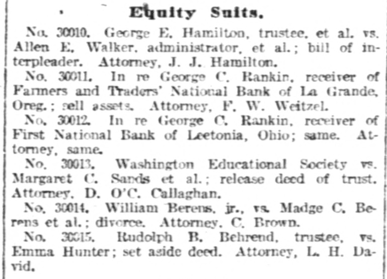 Equity Suits. No. 30010. George E. Hamilton, trustee. et al. VS. Allen E. Walker. administrator, et al.; bill of interpleader. Attorney, J. J. Hamilton. No. 30011. In re George C. Rankin. receiver of Farmers and Traders' National Bank of La Grande, Oreg.; sell assets. Attorney, F. W. Weitzel. No. 30012. In re George C. Rankin, receiver of First National Bank of Leetonia, Ohio; same. Attorney, same. No. 30013. Washington Educational Society VS. Margaret C. Sands et al.; release deed of trust. Attorney. D. O'C. Callaghan. No. 30014. William Berens, jr., VS. Madge C. Berens et al.; divorce. Attorney. C. Brown. No. 30015. Rudolph B. Behrend, trustee, vs. Emma Hunter; set aside deed. Attorney, L. H. David.