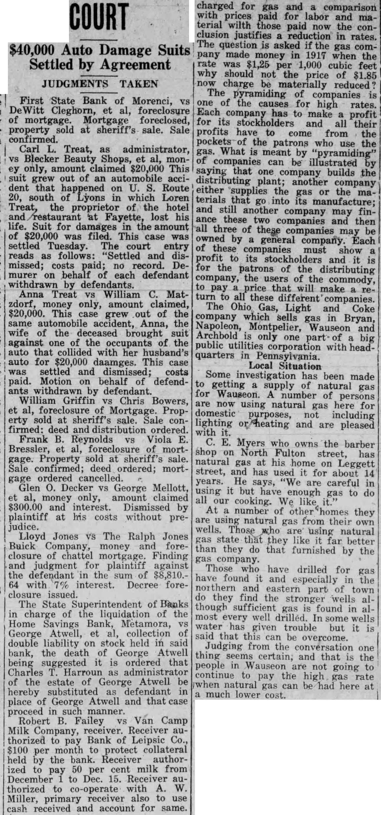 COURT $40,000 Auto Damage Suits Settled by Agreement JUDGMENTS TAKEN First State Bank of Morenci, al, of foreclosed, property at sheriff's sale. Sale Carl Treat, administrator, Beauty mononly, claimed This out accithat on Route south Lyons which Loren Treat, the of the hotel Fayette, lost his Suit for damages $20,000 filed. This Tuesday. court entry reads follows: "Settled and missed; costs record. murer behalf defendant withdrawn by defendants. Anna Treat William Matzdorf, money only, amount claimed, This grew out of Anna, the wife the deceased brought against one the occupants of collided husband's auto for $20,000 case settled and costs Motion on behalf defendWilliam Griffin Chris Bowers, al, erty deed Frank Reynolds Viola Bressler, Property sheriff's sale. confirmed; deed ordered; Decker George money only, $300.00 and interest. Dismissed by plaintiff at costs without judice. Lloyd Jones The Ralph Jones Buick money foreclosure of chattel mortgage. Finding judgment plaintiff against the defendant the with interest. Decree foreclosure issued The State of Banks charge of Home Savings Metamora, George Atwell, double liability stock held in bank, death George Atwell being suggested it ordered that the estate Atwell hereby place George Atwell and that case Robert Failey Van Camp Receiver pay Bank of Leipsic protect collateral by the Receiver authorto 50 per milk from pay December to Receiver thorized to co-operate Miller, cash and account for same. charged for gas and comparison prices paid for labor material wilth those the paid conclusion justifies reduction in rates. The question asked gas pany made money 1917 rate was 1,000 cubic feet why should the price charge be materially reduced The pyramiding the causes for high company to make profit for stockholders all their profits to from pockets the patrons who What meant by can be illustrated saying that one builds company the another company either the the terials that and company fintwo these general Each of its and the distributing of the commody that will make turn all these different The Ohio Light and Coke company which in Bryan, Napoleon, Montpelier, Archbold public utilities corporation headquarters Pennsylvania. Local Situation Some investigation been made getting supply natural for Wauseon. number of persons now using natural gas here domestic purposes, including lighting and are pleased Myers owns the barber shop on North Fulton street, natural gas at his on Leggett street, and has for about years. careful using but enough to gas our cooking. number they gas from their natural state that like better than they do that furnished by the have drilled for have found and especially part they the though sufficient found most drilled. water trouble but said that this overcome. Judging from the conversation one thing certain; and that the people Wauseon not going to continue pay the natural gas can be here much lower cost.