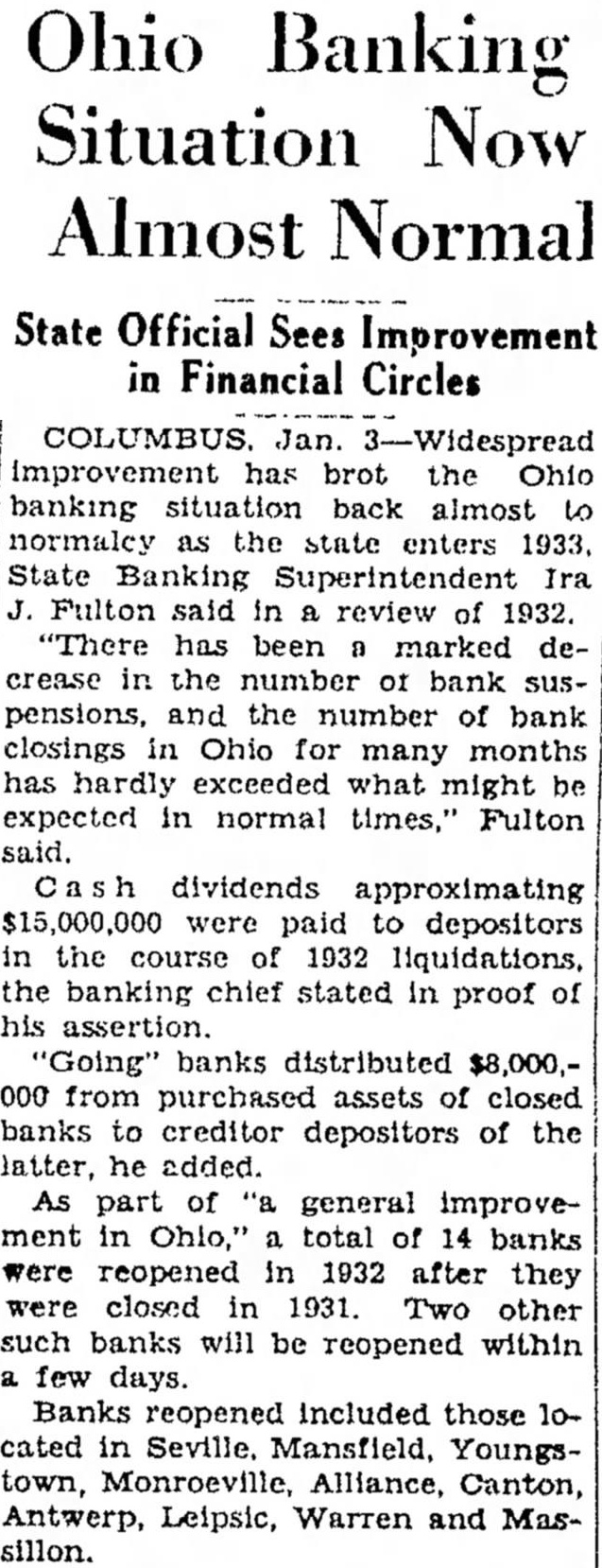 Ohio Banking Situation Now Almost Normal State Official Sees Improvement in Financial Circles COLUMBUS. Jan. improvement has brot the Ohio banking situation back almost to normaley as the state enters 1933. State Banking Superintendent Ira Fulton said in review of 1932. "There has been marked decrease in the number of bank suspensions, and the number of bank closings in Ohio for many months has hardly exceeded what might be expected in normal times," Fulton said. dividends approximating $15,000,000 were paid to depositors in the course of 1932 liquidations, the banking chief stated in proof of his assertion. "Going" banks distributed $8,000,000 from purchased assets of closed banks to creditor depositors of the latter, he added. As part of general improvement in Ohio," total of 14 banks were reopened in 1932 after they were closed in 1931. Two other such banks will be reopened within few days. Banks reopened included those located in Seville, Mansfield, Youngstown, Monroeville, Alliance, Canton, Antwerp, Leipsic, Warren and Massillon.