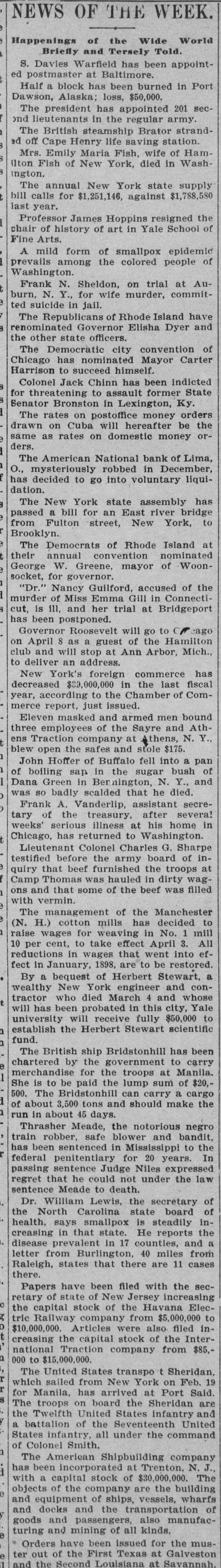 NEWS OF THE WEEK. Happenings of the Wide World Briefly and Tersely Told. S. Davies Warfield has been appointed postmaster at Baltimore. Half a block has been burned in Port Dawson, Alaska; loss, $50,000. The president has appointed 201 second lieutenants in the regular army. The British steamship Brator stranded off Cape Henry life saving station. Mrs. Emily Maria Fish, wife of Hamllton Fish of New York, died in Washington. The annual New York state supply bill calls for $1,251,146, against $1,788,580 last year. Professor James Hoppins resigned the chair of history of art in Yale School of Fine Arts. A mild form of smallpox epidemic prevails among the colored people of Washington. Frank N. Sheldon, on trial at Auburn, N. Y., for wife murder, committed suicide in jail. The Republicans of Rhode Island have renominated Governor Elisha Dyer and the other state officers. The Democratic city convention of Chicago has nominated Mayor Carter Harrison to succeed himself. Colonel Jack Chinn has been indicted for threatening to assault former State Senator Bronston in Lexington, Ky. The rates on postoffice money orders drawn on Cuba will hereafter be the same as rates on domestic money orders. The American National bank of Lima, O., mysteriously robbed in December, has decided to go into voluntary liquidation. The New York state assembly has passed a bill for an East river bridge from Fulton street, New York, to Brooklyn. The Democrats of Rhode Island at their annual convention nominated George W. Greene, mayor of Woonsocket, for governor. "Dr." Nancy Guilford, accused of the murder of Miss Emma Gill in Connecticut, is III, and her trial at Bridgeport has been postponed. cago Governor Roosevelt will go to on April 8 as a guest of the Hamilton club and will stop at Ann Arbor, Mich., to deliver an address. New York's foreign commerce has decreased $39,000,000 in the last fiscal year, according to the Chamber of Commerce report, just issued. Eleven masked and armed men bound three employees of the Sayre and Athens Traction company at Athens, N. Y., blew open the safes and stole $175. John Hoffer of Buffalo fell into a pan of boiling sap in the sugar bush of Dana Green in Bennington, N. Y., and was SO badly scalded that he died. Frank A. Vanderlip, assistant secretary of the treasury, after severa! weeks' serious illness at his home in Chicago, has returned to Washington. Lieutenant Colonel Charles G. Sharpe testified before the army board of inquiry that beef furnished the troops at Camp Thomas was hauled in dirty wagons and that some of the beef was filled with vermin. The management of the Manchester (N. H.) cotton mills has decided to raise wages for weaving in No. 1 mill 10 per cent, to take effect April 3. All reductions in wages that went into effect in January, 1898, are to be restored. By a bequest of Herbert Stewart, a wealthy New York engineer and contractor who died March 4 and whose will has been probated in this city, Yale university will receive fully $50,000 to establish the Herbert Stewart scientific fund. The British ship Bridstonhill has been chartered by the government to carry merchandise for the troops at Manila. She is to be paid the lump sum of $20,500. The Bridstonhill can carry a cargo of about 3,500 tons and should make the run in about 45 days. Thrasher Meade, the notorious negro train robber, safe blower and bandit, has been sentenced in Mississippi to the federal penitentiary for 20 years. In passing sentence Judge Niles expressed regret that he could not under the law sentence Meade to death. Dr. William Lewis, the secretary of the North Carolina state board of health, says smallpox is steadily increasing in that state. He reports the disease prevalent in 17 counties, and a letter from Burlington, 40 miles from Raleigh, states that there are 11 cases there. Papers have been filed with the secretary of state of New Jersey increasing the capital stock of the Havana Electric Railway company from $5,000,000 to $10,000,000. Articles were also filed increasing the capital stock of the International Traction company from $85,000 to $15,000,000. The United States transpo t Sheridan, which salled from New York on Feb. 19 for Manila, has arrived at Port Said. The troops on board the Sheridan are the Twelfth United States infantry and a battalion of the Seventeenth United States infantry, all under the command of Colonel Smith. The American Shipbuilding company has been incorporated at Trenton, N. J., with a capital stock of $30,000,000. The objects of the company are the building and equinment of shins vessels wharfs