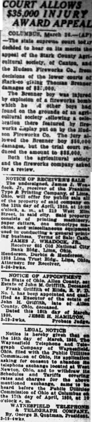COURT $35,000 APPEAL COLUMBUS, March state supreme court decided to hear on its merits the appeal of the Stark County Agricultural society, of Canton, the Hudson Fireworks Co., from decisions of the lower courts Stark-co giving Thomas Brenner damages of The boy was injured by explosion which he id other boys had found on the grounds of an cultural society bration there featured by fireworks emplay put on by the Hudson Co. The jury lowed the Brenner $50,000 damages, but the trial court reduced the amount to $35,000. Both the agricultural society and the fireworks company asked for review. NOTICE OF SALE the Franklin will offer for company the day April, 1930. Street, said Said property printing machinery, paper one business. Terms JAMES Receiver Old National City Bank Lima, 1208 Trust Bldg., Lima, Ohios Attorneys for NOTICE OF John Frank Griffith of Elida, appointed Allen Dated this 18th Marchs JESSE Probate LEGAL NOTICE Notice given that the 15th March, 1930, Waynesfield Telephone graph Company Public Utilities Ohio, asking for consent telephone located Ohio, Tariffs covering rates charges the heard before Utilities Commission the day of April, COMPANY. B. Quatman, President.
