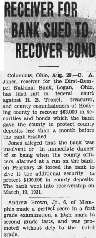 RECEIVER FILES SUIT FOR BANK Secks to Recover Securities Deposited in Institution Before Its Failure. Columbus, O., Aug. 29, (U.P)-C. Jones, receiver for the National Bank, Logan, O., has filed sult in federal court against H. Troxel, treasurer, and county commissioners of Hocking county to cover $63,000 In securities and bonds which the bank gave the county to protect county deposits less than month before the bank crashed. Jones alleged that the bank was Insolvent or In immediate danger of so being when the county officers, alarmed frim on the bank, on Feb. 28 forced the bank to give the additional security to protect $100,000 county reposits. The bank went into receivership March 19, 1931.