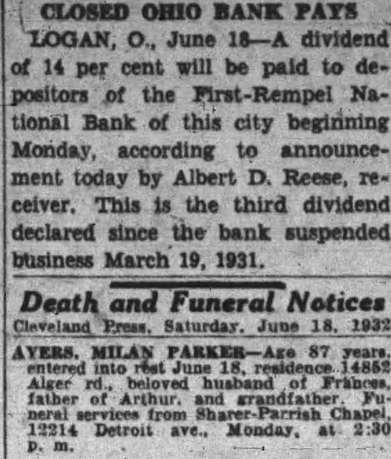 CLOSED OHIO BANK PAYS LOGAN, O., June 18-A dividend of 14 per cent will be paid to depositors of the -Rempel National Bank of this city beginning Monday, according to announcement today by Albert D. Reese, receiver. This is the third dividend declared since the bank suspended business March 19, 1931. Death and Funeral Notices Cleveland Press. Saturday. June 18. 1932 AYERS. MILAN PARKER- 87 years. beloved father and services from 12214 Detroit Monday, 2:30
