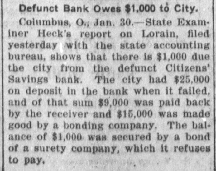 Defunct Bank Owes $1,000 to City. Columbus, O., Jan. 30.-State Examiner Heck's report on Lorain, filed yesterday with the state accounting bureau, shows that there is $1,000 due the city from the defunct Citizens' Savings bank. The city had $25,000 on deposit in the bank when it failed, and of that sum $9,000 was paid back by the receiver and $15,000 was made good by a bonding company. The balance of $1,000 was secured by a bond of a surety company, which it refuses to pay.