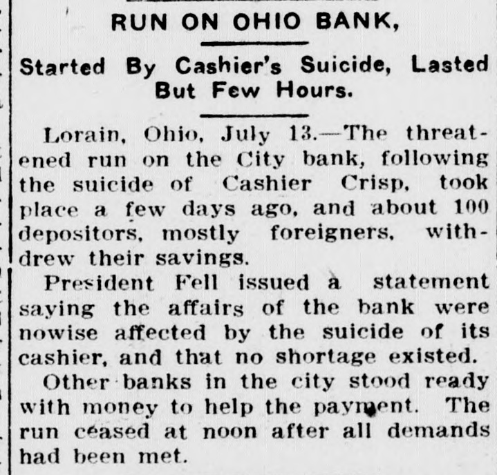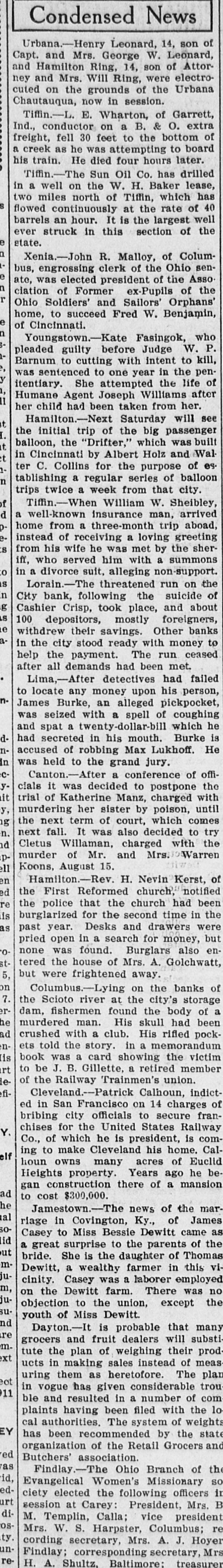 Condensed News Urbana.-Henry Leonard, 14, son Capt. and Mrs. George W. Leonar and Hamilton Ring, 14, son of ney and Mrs. Will Ring, were electr cuted on the grounds of the Urbar Chautauqua, now in session. Tiffin.-L. E. Wharton, of Garret o a '8 B uo conductor "puI freight, fell 30 feet to the bottom a creek as he was attempting to his train. He died four hours later. Tiffin.-The Sun Oil Co. has drille in a well on the W. H. Baker two miles north of Tiffin, which S flowed continuously at the rate of barrels an hour. It is the largest ever struck in this section of a state. D Xenia.-John R. Malloy, of Colur bus, engrossing clerk of the Ohio e ate, was elected president of the u clation of Former ex-Pupils of J Ohio Soldiers' and Sailors' Orphan home, to succeed Fred W. Benjami a JO u in pleaded guilty before Judge W. Barnum to cutting with intent to ai was sentenced to one year in the A itentiary. She attempted the life 'I Humane Agent Joseph Williams II her child had been taken from her. Hamilton.-Next Saturday will 71 'I the initial trip of the big passeng balloon, the "Drifter," which was 71 in Cincinnati by Albert Holz and 13 -t ter C. Collins for the purpose of u tablishing a regular series of ballo trips twice a week from that city. JO Tiffin.-When William W. Sheible P a well-known insurance man, Ó home from a three-month trip aboa e. instead of receiving a loving greetir s: from his wife he was met by the iff, who served him with a summo o: in a divorce suit, alleging non-suppo S Lorain-The threatened run on u City bank, following the suicide 8 Cashier Crisp, took place, and S1 100 depositors, mostly foreigner 0 withdrew their savings. Other a in the city stood ready with money help the payment. The run after all demands had been met. Lima,-After detectives had to locate any money upon his È James Burke, an alleged pickpock was seized with a spell of coughi and spat a twenty-dollar-bill which -p had secreted in his mouth. Burke I accused of robbing Max Lukhoff. uj was held to the grand jury. & Canton.-After a conference of -A cials it was decided to postpone 71 trial of Katherine Manz, charged 'A murdering her sister by poison, Su the next term of court, which n. next fall. It was also decided to pu Cletus Willaman, charged with murder of Mr. and DII Koons, August 15. ue Hamilton.-Rev. H. Nevin Kerst, pe the First Reformed church, e. the police that the church had SI burglarized for the second time in ST past year. Desks and drawers pried open in a search for money, -0 none was found. Burglars also to tered the house of Mrs. A. Golchwa 'g but were frightened away. uo Columbus.-Lying on the banks '2 the Scioto river at the city's stora g dam, fishermen found the body of et murdered man. His skull had pt crushed with a club. His rifled 11ets told the story. in a memorandu st book was a card showing the 11 to be J. B. Gillette, a retired Φ of the Railway Trainmen's union. f. Cleveland.-Patrick Calhoun, ed in San Francisco on 14 charges bribing city officials to secure chises for the United States Railw 'A Co., of which he is president, is ing to make Cleveland his home. III houn owns many acres of Heights property. Years ago he gan construction there of a mansi per to cost $300,000.