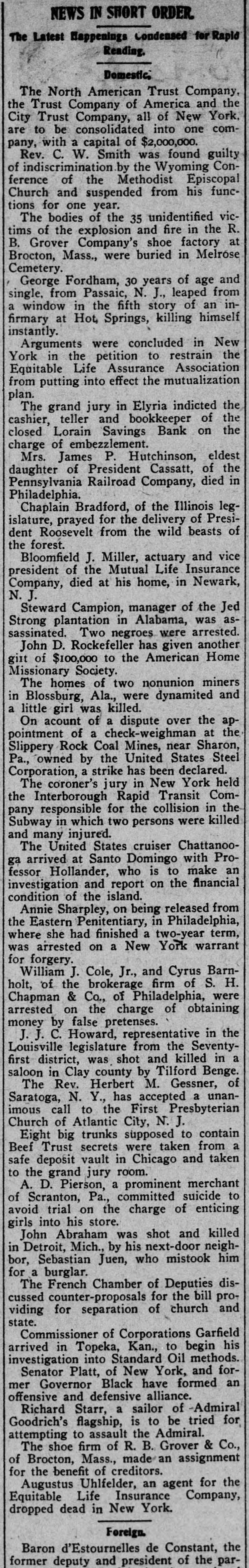 NEWS IN SHORT ORDER. The Latest Happenings Condensed for Rapid Reading. Domestic, The North American Trust Company, the Trust Company of America and the City Trust Company, all of New York, are to be consolidated into one company, with a capital of $2,000,000. Rev. C. W. Smith was found guilty of indiscrimination by the Wyoming Conference of the Methodist Episcopal Church and suspended from his functions for one year. The bodies of the 35 unidentified victims of the explosion and fire in the R. B. Grover Company's shoe factory at Brocton, Mass., were buried in Melrose Cemetery. George Fordham, 30 years of age and single, from Passaic, N. J., leaped from a window in the fifth story of an infirmary at Hot, Springs, killing himself instantly. Arguments were concluded in New York in the petition to restrain the Equitable Life Assurance Association from putting into effect the mutualization plan. The grand jury in Elyria indicted the cashier, teller and bookkeeper of the closed Lorain Savings Bank on the charge of embezzlement. Mrs. James P. Hutchinson, eldest daughter of President Cassatt, of the Pennsylvania Railroad Company, died in Philadelphia. Chaplain Bradford, of the Illinois legislature, prayed for the delivery of President Roosevelt from the wild beasts of the forest. Bloomfield J. Miller, actuary and vice president of the Mutual Life Insurance Company, died at his home, in Newark, N.J. Steward Campion, manager of the Jed Strong plantation in Alabama, was assassinated. Two negroes were arrested. John D. Rockefeller has given another gift of $100,000 to the American Home Missionary Society. The homes of two nonunion miners in Blossburg, Ala., were dynamited and a little girl was killed. On acount of a dispute over the appointment of a check-weighman at the Slippery Rock Coal Mines, near Sharon, Pa., owned by the United States Steel Corporation, a strike has been declared. The coroner's jury in New York held the Interborough Rapid Transit Company responsible for the collision in the Subway in which two persons were killed and many injured. The United States cruiser Chattanooga arrived at Santo Domingo with Professor Hollander, who is to make an investigation and report on the financial condition of the island. Annie Sharpley, on being released from the Eastern Penitentiary, in Philadelphia, where she had finished a two-year term, was arrested on a New York warrant for forgery. William J. Cole, Jr., and Cyrus Barnholt, of the brokerage firm of S. H. Chapman & Co., of Philadelphia, were arrested on the charge of obtaining money by false pretenses. J. J. C. Howard, representative in the Louisville legislature from the Seventyfirst district, was shot and killed in a saloon in Clay county by Tilford Benge. The Rev. Herbert M. Gessner, of Saratoga, N. Y., has accepted a unanimous call to the First Presbyterian Church of Atlantic City, N. J. Eight big trunks supposed to contain Beef Trust secrets were taken from a safe deposit vault in Chicago and taken to the grand jury room. A. D. Pierson, a prominent merchant of Scranton, Pa., committed suicide to avoid trial on the charge of enticing girls into his store. John Abraham was shot and killed in Detroit, Mich., by his next-door neighbor, Sebastian Juen, who mistook him for a burglar. The French Chamber of Deputies discussed counter-proposals for the bill providing for separation of church and state. Commissioner of Corporations Garfield arrived in Topeka, Kan., to begin his investigation into Standard Oil methods. Senator Platt, of New York, and former Governor Black have formed an offensive and defensive alliance. Richard Starr, a sailor of -Admiral Goodrich's flagship, is to be tried for attempting to assault the Admiral. The shoe firm of R. B. Grover & Co., of Brocton, Mass., made an assignment for the benefit of creditors. Augustus Uhlfelder, an agent for the Equitable Life Insurance Company, dropped dead in New York. Foreign. Baron d'Estournelles de Constant, the former deputy and president of the par-