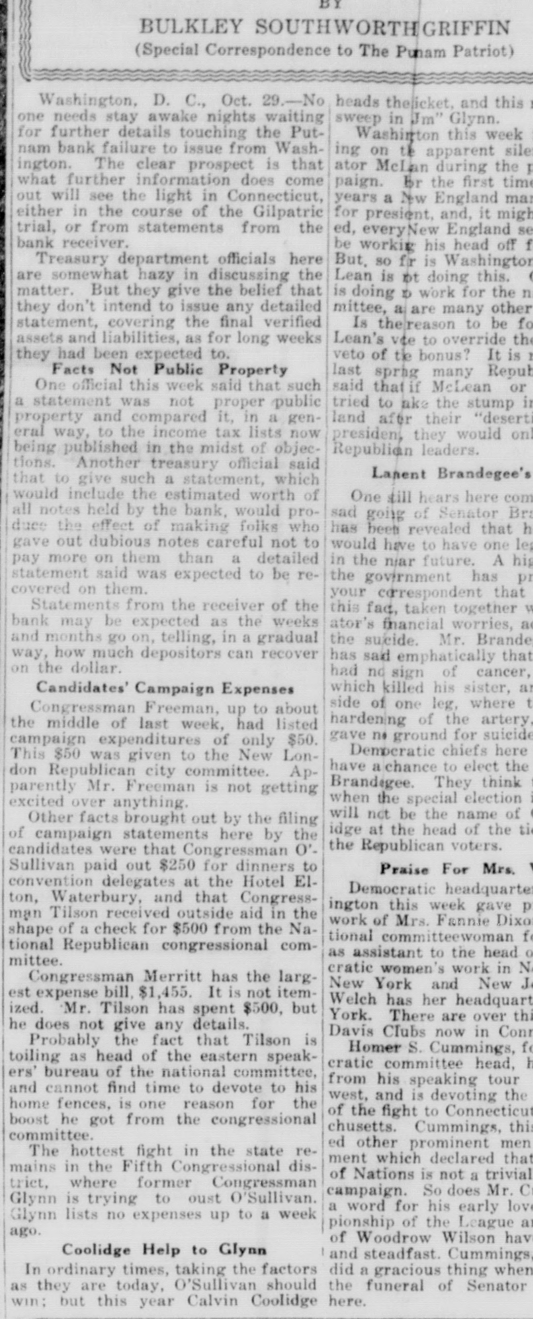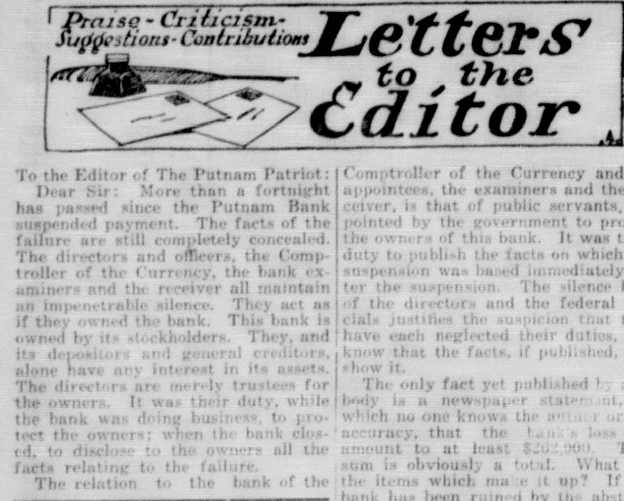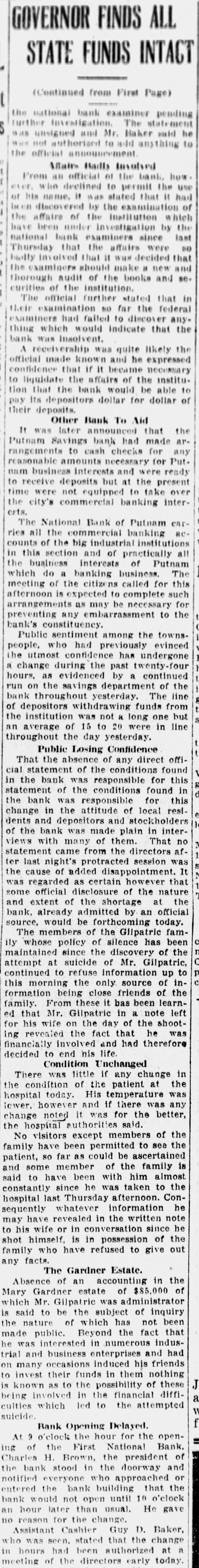 ALL FINDS GOVERNOR STATE FUNDS INTACT (Continued from First Page) the bank national examiner pending The statement Insertigation. he said Haker not aut was the official further was unsigned horized and Mr. to add anything to stails Adair Insured et the all From bank. official to the even who permit deelined it was had that stated of have the of his discovered name. if by the Institution examinar hieh been examiners the affairs under of the since by last 60 were Thursday that national bank that the affairs decided that new and limity examineral involved should of the books and sethorough the audit the institution. in that stated curities The official of further 60 far the er federal any examiners which would their examination had falled indicate to discove that the A the official made known if it that became confidence bank thing receivership was Insolvent was and quite he likely expressed necessary of the the affairs instituto be able would its of to tion liquidate that depositors the bank dollar for dollar " the pay their deposits. Bank To Aid that Putnam savings to cash for checks was Other later announced bank had made any arrangements (or Putamounts reasonable necessary nam and ready business Interests at but the present time over take the city's erts. to receive were deposits commercial not equipped banking to interearBank of banking Putnam instituti ions acin this ries The all the all the business a do which hanking business counts of section the interests and of of Putnam The of for this the called meeting citizens is such expected complete be for necessary to the any preventing bank's the constituency townsamong Public sentiment who had evinced people, previously the has utmost ndergone confidence a the past change twenty-four during as by hours. evidenced continued the on run of the savings department The line bank yesterday throughout of from funds the depositors was not but one long institution an in of line were average the day yesterday. throughout Public Losing Confidence of the offiany direct absence the found for this in the bank of the statement was the bank cial That statement was of responsible conditions for found this in responsible in of the resilocal change attitude and dents 1 in depositors a of stockholders was the bank plain interwith That no of views many affrom came directors statement was ter last session night's It of the cause added was that disappoliente regarded of the some nature official disclosure at of the the and extent shortage by an bank, official already admitted be today. would the forthcomingries famGilpatric c ily been whose the since of Mr. source, The members policy of of silence discovery has of the Gilpatric, up continued the friends attempt maintained to suicide refuse only information source of of the inlearnfamily. Mr. Gilpatric of the day formation this morning being these close it bas in been note shoot- left was he reven ed for that his wife on the the fact and that had therefore ing financially his life. was little There of the patient decided Condition to end Unchange if any at the in was any temperature change the hospital hospital the condition however, today. and His if for there the better, of jower." noted it was said. the No except visitors authorit members see the to have been family permitted be so as far could patient, ascertain is of the some and family member with to him said been have almost to the he was since taken constantly Conlast Thursday hospital afternoon. he whatever information sequently the note may written have revealed he in or wife since to his is of in the shot conversession himself. to out who give have refused family Estate. in the of Absence estate was any facts. The an of which Iministrator to be is said inquiry of the has which nature the Mary Gardnipatric Mr. subject of not been that fact made public. Beyond in he induswas interested had and and trial business on enterprises friends many induced in to their them nothing invest of is J the these known possibility in diffia being involved the led which W the finandiemptod cuities f suicide. Bank pelayed. Opening 9 At for the the openo'clock the First Bank. National of the president and doorway notified building Charles ing of H. stood Brown. who the approached that the or 10 until bank o'clock He than gave usual. hour the no for change. D. Guy Baker. Cashier the that change a at hours the Assistant had stated been directors authorized early today