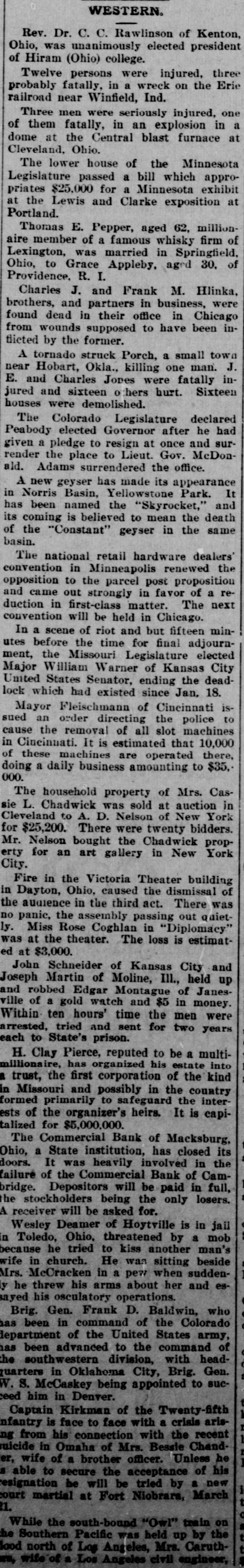 WESTERN. Rev. Dr. C. C. Rawlinson of Kenton, Ohio, was unanimously elected president of Hiram (Ohio) college. Twelve persons were injured, three probably fatally, in a wreck on the Erie railroad near Winfield, Ind. Three men were seriously injured, one of them fatally, in an explosion in a dome at the Central blast furnace at Cleveland, Ohio. The lower house of the Minnesota Legislature passed a bill which appropriates $25,000 for a Minnesota exhibit at the Lewis and Clarke exposition at Portland. Thomas E. Pepper, aged 62, millionaire member of a famous whisky firm of Lexington, was married in Springfield, Ohio, to Grace Appleby, aged 30, of Providence, R. I. Charles J. and Frank M. Hlinka, brothers, and partners in business, were found dead in their office in Chicago from wounds supposed to have been inflicted by the former. A tornado struck Porch, a small town near Hobart, Okla., killing one man. J. E. and Charles Jones were fatally injured and sixteen 0 thers hurt. Sixteen houses were demolished. The Colorado Legislature declared Peabody elected Governor after he had given a pledge to resign at once and surrender the place to Lieut. Gov. McDonald. Adams surrendered the office. A new geyser has made its appearance in Norris Basin, Yellowstone Park. It has been named the "Skyrocket," and its coming is believed to mean the death of the "Constant" geyser in the same basin. The national retail hardware dealers' convention in Minneapolis renewed the opposition to the parcel post proposition -er B JO JOAN u! ano came pus duction in first-class matter. The next convention will be held in Chicago. In a scene of riot and but fifteen minutes before the time for final adjournment, the Missouri Legislature elected Major William Warner of Kansas City United States Senator, ending the deadlock which had existed since Jan, 18. Mayor Fleischmann of Cincinnati issued an order directing the police to cause the removal of all slot machines in Cincinnati. It is estimated that 10,000 of these machines are operated there, doing a daily business amounting to $35, *000 The household property of Mrs. Cassie L. Chadwick was sold at auction in Cleveland to A. D. Nelson of New York for $25,200. There were twenty bidders. Mr. Nelson bought the Chadwick property for an art gallery in New York City. Fire in the Victoria Theater building in Dayton, Ohio, caused the dismissal of the audience in the third act. There was no panic, the assembly passing out quietly. Miss Rose Coghlan in "Diplomacy" was at the theater. The loss is estimated at $3,000. John Schneider of Kansas City and Joseph Martin of Moline, Ill., held up and robbed Edgar Montague of Janesville of a gold watch and $5 in money. Within ten hours' time the men were arrested, tried and sent for two years each to State's prison. H. Clay Pierce, reputed to be a multimillionaire, has organized his estate into a trust, the first corporation of the kind in Missouri and possibly in the country formed primarily to safeguard the interests of the organizer's heirs. It is capitalized for $5,000,000. The Commercial Bank of Macksburg, Ohio, a State institution, has closed its doors. It was heavily involved in the failure of the Commercial Bank of Cambridge. Depositors will be paid in full, he stockholders being the only losers. A receiver will be asked for. Wesley Deamer of Hoytville is in jail in Toledo, Ohio, threatened by a mob because he tried to kiss another man's wife in church. He was sitting beside Mrs. McCracken in a pew when suddeny he threw his arms about her and essayed his osculatory operations. Brig. Gen. Frank D. Baldwin, who has been in command of the Colorado department of the United States army, has been advanced to the command of the southwestern division, with headuarters in Oklahoma City, Brig. Gen. W. S. McCaskey being appointed to succeed him in Denver. Captain Kirkman of the Twenty-fifth nfantry is face to face with a crisis arisng from his connection with the recent suicide in Omaha of Mrs. Bessie Chander, wife of a brother officer. Unless he s able to secure the acceptance of his Meu . sq pepsi eq IIIM eq at Fort Niobrara, March