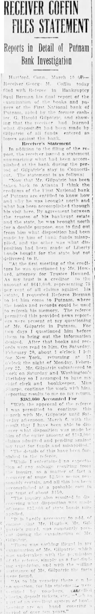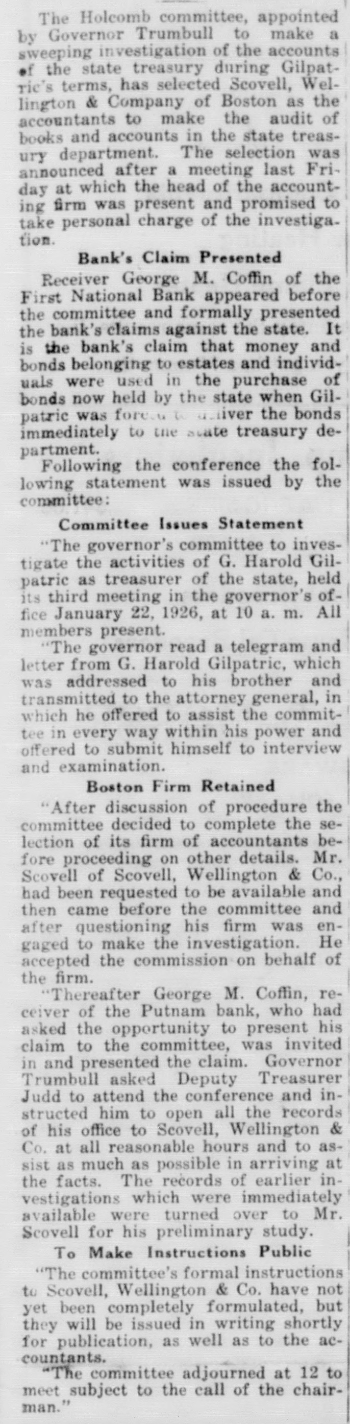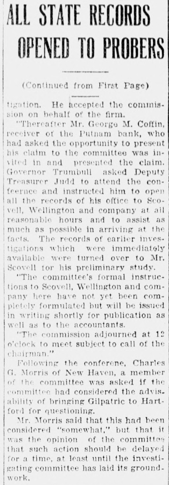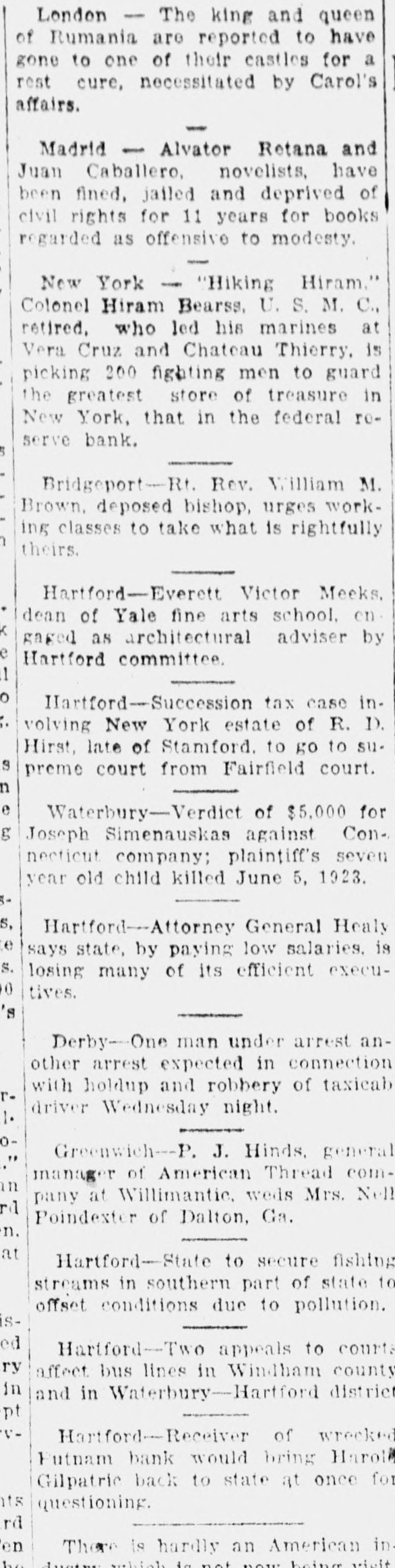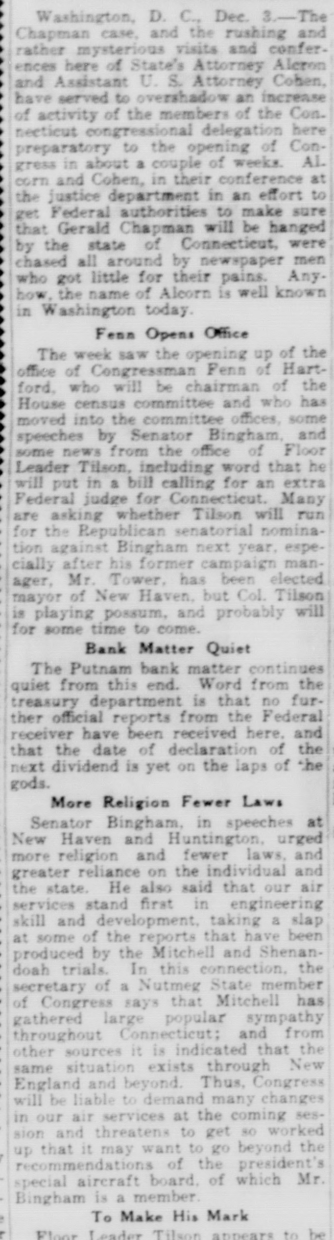 Washington, D. C., Dec. 3.-The Chapman case, and the rushing and rather mysterious visits and conferences here of State's Attorney Aleron U. S. Attorney to an have and Assistant served overshadow of the increase Cohen, Con. of activity of the members meeticut congressional delegation here preparatory to the opening of Congress in about a couple of weeks. Al. corn and Cohen, in their conference at the justice department in an effort to get Federal authorities to make sure that Gerald Chapman will be hanged by the state of Connecticut, were chased all around by newspaper men who got little for their pains. Any. how. the name of Alcorn is well known in Washington today. Fenn Opens Office The week saw the opening up of the office of Congressman Fenn of Hartford. who will be chairman of the House census committee and who has moved into the committee offices, some speeches by Senator Bingham, and some news from the office of Floor Leader Tilson, including word that he will put in a bill calling for an extra Federal judge for Connecticut. Many are asking whether Tilson will run for the Republican senatorial nomination against Bingham next year. especially after his former campaign manager, Mr. Tower, has been elected mayor of New Haven, but Col. Tilson is playing possum, and probably will for some time to come. Bank Matter Quiet The Putnam bank matter continues quiet from this end. Word from the treasury department is that no further official reports from the Federal receiver have been received here. and that the date of declaration of the next dividend is yet on the laps of the gods. More Religion Fewer Laws Senator Bingham, in speeches at New Haven and Huntington, urged more religion and fewer laws, and greater reliance on the individual and the state. He also said that our air services stand first in engineering skill and development, taking a slap at some of the reports that have been produced by the Mitchell and Shenandoah trials. In this connection. the secretary of a Nutmeg State member of Congress says that Mitchell has gathered large popular sympathy throughout Connecticut; and from other sources it is indicated that the same situation exists through New England and beyond. Thus, Congress will be liable to demand many changes in our air services at the coming session and threatens to get so worked up that it may want to go beyond the recommendations of the president's special aircraft board. of which Mr. Bingham is a member. To Make His Mark Floor Leader Tilson annears to be