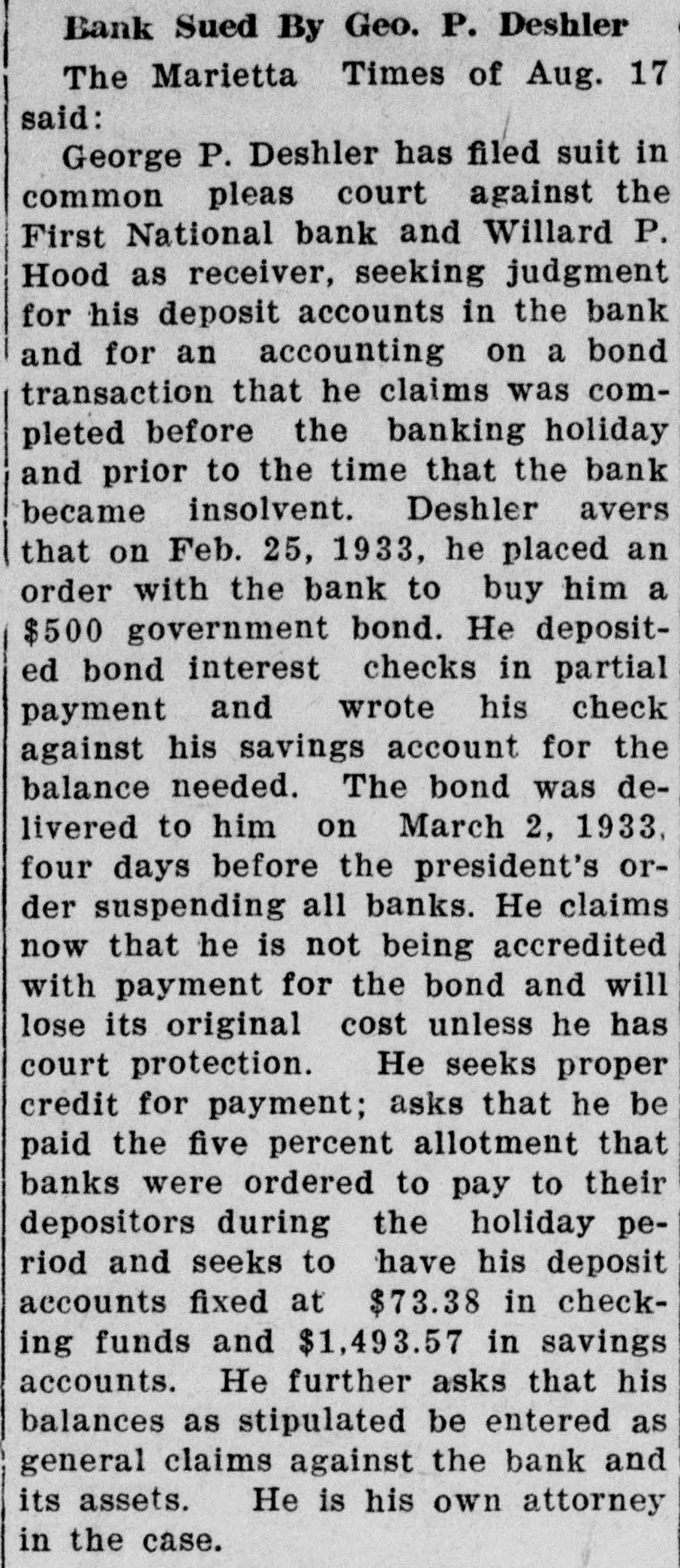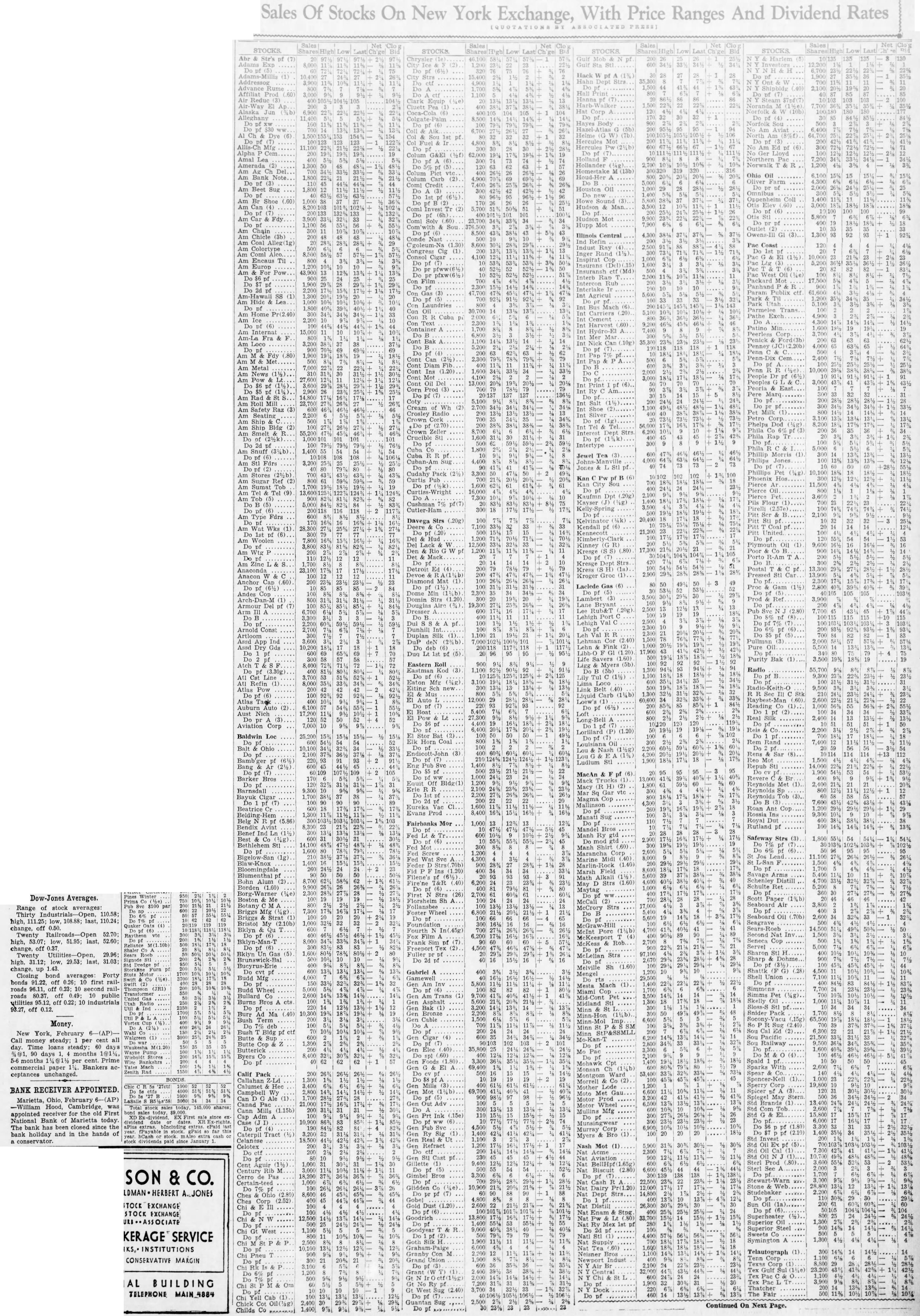 Sales Of Stocks On New York Exchange, With Price Ranges And Dividend Rates Sales STOCKS Low Abr & Str's of 20 Adams 8,000 Do Adams-Millis (1) Addressog Advance Rume Affiliat Prod .60) 3,000 Air Reduc (3) Alaska Jun (%b) 6,900 Alleghany 11,400 Al Ch Dye 154% Do pf (7) Allis-Ch Mfg Alpha Amal Lea Amerada Am Ag Ch Del Am Bank Note. Do pf (3) Am Beet Sug Do pf Am Br Shoe (.60) Am Can Am Car Fdy 3,900 Am Chain Am Chicle (3b) Am Coal Alleg(1g) Am Colortype 3,200 9% 9% Sales Net STOCKS Shares Low Last 1,200 320 City Strs 15,400 4,900 A ctf Clark Equip Cluett Pea (1) 400 Coca-Cola (6) 400/105 Palm 8,500 pf Colum 62,000 Colum Colum Com'wlth Sou C'goleum-Na Congress (1) Consol Laundries Cuba Con Text Container Cont Bak Diam Cont Mot Del 13,000 (3) Cream Crosley Radio Crucible Cuban-Am Cudahy Pack Curtis Curtiss-Wright Cushman 7% Cutler-Ham Davega Strs 7% 12,500 pf Mack Detroit Devoe Diamond Mat Do Domin Douglas 19,300 Dresser Dunhill Duplan Silk (1) deN (2%b) Do Duq 95 Eastern Eastman (3) Do pf (6) Eaton Eiting El Auto L El Pow & Lt 27,300 Bat Endicott-John Do pf (7) Eng Pub Sve Do $5 pf WW Bldg(1) Erie R R Do 1st pf Do 2d pf Evans Prod 8,400 16% Sales STOCKS Last Gulf 200 Gulf Sta Stl Hack pf 27 28 Hahn Dept Strs 35,300 Do 1,500 44 Hall Print Hanna Harb-Walker 1,500 Hat Corp 120 Hayes Body 2% Hazel- (5b) Helme (7b) Hercules Hercules Pw Holland Hollander Homestake M (13b) Houd-Her Houston Oil Howe Sound Hudson Man. Hudson Mot Hupp Mot Illinois Central Indust Ray Inger Rand (1½) Inspirat Insurans Insuransh ctf Md) Interb Intercon Interlake Agricul Bus Mach Carriers Cement Harvest Hydro-El Int Nick 56,000 Interest Intertype Jewel Tea 600 Johns-Manville 4,000 Jones pf Kan Pw Sou Do pf Kaufmn Dpt Kayser Spring Kendall (6) Kennecott Kimberly-Clark Kinney Kresge (S S) (.80) Kresge Kress Kroger Laclede Do pf (5) Lambert (3) Lane Bryant Rub&T Lehigh Port C Lehigh Val C Leh Val R R Lehman Life Savers (1.60) Ligg & Myers (5b) Link Belt (.40) Raybest-Man Reading Real Rand Rens Sar (8). Mot Lorillard Do 1 pf Do pf (7) Louisiana Ludlum Stl Repub Stl MacAn Revere Mack Reynolds (1). Macy (R H) (2) Reynolds vtc Reynolds Magma Cop Do B (3) Mallinson Do pf Manati Sug Fairbanks Mor 1,000 Mandel Manh Ry (6) Do mod gtd Fed Mot Fed Screw Marancha Corp Royal pf Safeway Strs St Sales Net STOCKS Low Harlem (5) 135 135 6,700 N Ont 103 Noranda (10b) Do Norfolk Sou Am Aviat No Norwalk Ohio Oil Farm Omnibus Oppenheim Coll 3,000 Otis Stl Do pr pf 400 Outlet Owens-Ill 1,300 Pac 120 Do 1st 10,000 Pac Ltg (3) 5,200 Packard 17,500 Panhand Param Publix ctf Park & Til Parmelee Trans Pathe Exch Do Patino Min. Peerless Penick Ford(3b) Penney (JC)(2.20b) Penn Penn-Dix Do 10,000 People Peoples GL Peoria Marq Pet Milk 5,000 Phillip Morris (1). Philips Jones Phillips Pet 10,100 Phoenix Pierce 11,500 Pierce Pils Flour (1) pf Plymouth Oil 9,600 Postal Pressed Stl 13,900 Gam (1%) Do pf (5) Prod & Ref Do 6% pf (6) Do $5 pf (5) Pullman Pure Purity Bak (1) 3,500 Radio 55,700 Radio-Keith-O 9,500 Sec Stk 1,000 2,400 14 7,400 12 56 +13 14,000 400 100 Savage Arms Schenley Distill Schulte Ret Paper (1%b) Seaboard Air 3,800 Seaboard Marlin-Rock Marsh Filene's Alkali Fire'ne (.40) 6,200 Dow-Jones Averages. Range of stock averages: Thirty Industrials -Open, 110.58 high, 111.25; low, 108.88; last, 110.24; change, off 0.50. Twenty Railroads- Open 52.70; high, 53.07; low, 51.95; last, 52.60; change, off 0.37 Twenty Utilities-Open, 29.96; high. 31.12; low, 29.53; last, 31.03; change, up 1.43. Closing bond averages: Forty bonds 91.22, off 0.26; 10 first railroads 96.11, off 0.23; 10 second railroads 80.37, off 0.49: 10 public utilities 95.12, off 0.22; 10 industrials 93.27, off 0.12. Money. New York, February 6-(AP)Call money steady; per cent all day. Time loans steady; 60 days %@1, 90 days 1, 4 months 1@1½, 5-6 months 11/4 per cent. Prime commercial paper 1%. Bankers acceptances unchanged. BANK RECEIVER APPOINTED Marietta, Ohio, February 6-(AP) -William Hood, Cambridge was appointed receiver for the old First National Bank of Marietta today. The bank has been closed since the bank holiday and in the hands of conservator. Pines Winter Prima Sve $100 par Quaker Oats (4) M(1.10b) Shaler Sears Dredge Stutz Thompson (JR1) Transformer United Gas Utah Radio Util Ind Vortex Cup Walgreen (1) Waukesha M(1.20) Wayne Pump Stores Wise Bankshrs Yates Mach Zenith Rad BONDS 27ctf Total stock 145,000 shares; bond sales exdividend date Ex-rights. stock. gPaid this year. fPayable year. hCash stock mAlso cash or stock dividends paid since January Do B Maytag (26) 2,700 Florsheim Sh McCall Follansbee McCrory Strs Foster Wheel Do pf Seagrave Foundation McGraw-Hill Sears-Roeb Fourth N In(.45g) McInt Inv Film 6,200 McKeesport McKess Rob Servel Freeport Tex Do pf Sharon Fuller pr pf McLellan Strs Sharp Dohme Do 2d pf Do pf Melville Sh (1.60) Gabriel 400 Shattk G) (.28 Mengel Gamewell Shell Union Inv Mesta Mach (1) Simmons Do pf (6) Miami Trans (1) Simms Pet Mid-Cont Pet Asphalt Skelly Oil Midland Sloss-S Minn St Bronze Snider Pack Minn-Hon Cable Vacu Minn-Mol SM Sug Ed StP&SSMLL Cigar Pacific Mo-Kan-T Railway Do pf Borg-Warner Boston Botany Briggs Briggs Strat Bristol Bklyn Do pf (6) Bklyn-Man-T Do pf (6) 5,000 Bklyn (5) Brunswick Bal Bucyrus-Erie cvt Budd Mfg Do pf Budd Wheel Bullard Co Burns Bros Do Burr Ma Term Bush Bldg pf ctf Butte Sup Butte Cop Butterick 35,800 Byers Co Do pf Gen Foods (1.80) Spald Do pf Mohawk Cpt 69,400 Sparks Monsan Calif Pack Montgom Ward Do $8 pf A Spencer-Kell Callahan Morrell (2) Calumet Hec Mother Lode Sperry Spicer Campbell Wy Moto Ale Spiegel May Stern Motor Adv Brands Canad Pac Motor Wheel Std Com Tob Cann Mills (1.15b) Mullins Mfg Cap Adm Do pf (6) Munsingwear Do pf (4) Murray 1,400 Caterpil Tract Myers Bro Invest Celanese 5,900 30% Celotex Refract Nash Mot (1) ctf Acme Do pf St1 pf Aviation Cent Aguir (1½) 1,000 31 Gillette Sec Century Rib M Biscuit Cerro Pas 18,200 Gimbel Stewart-Warn Certain-teed 1,000 Glidden 10,900 Stone Web Do Dairy Pr(1