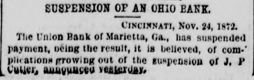 SUSPENSION OF AN OHIO BANK. CINCINNATI, Nov. 24, 1872. The Union Bank of Marietta, Ga., has suspended payment, being the result, it is believed, of complications growing out of the suspension of J. P Cuiler, announced vesterday,