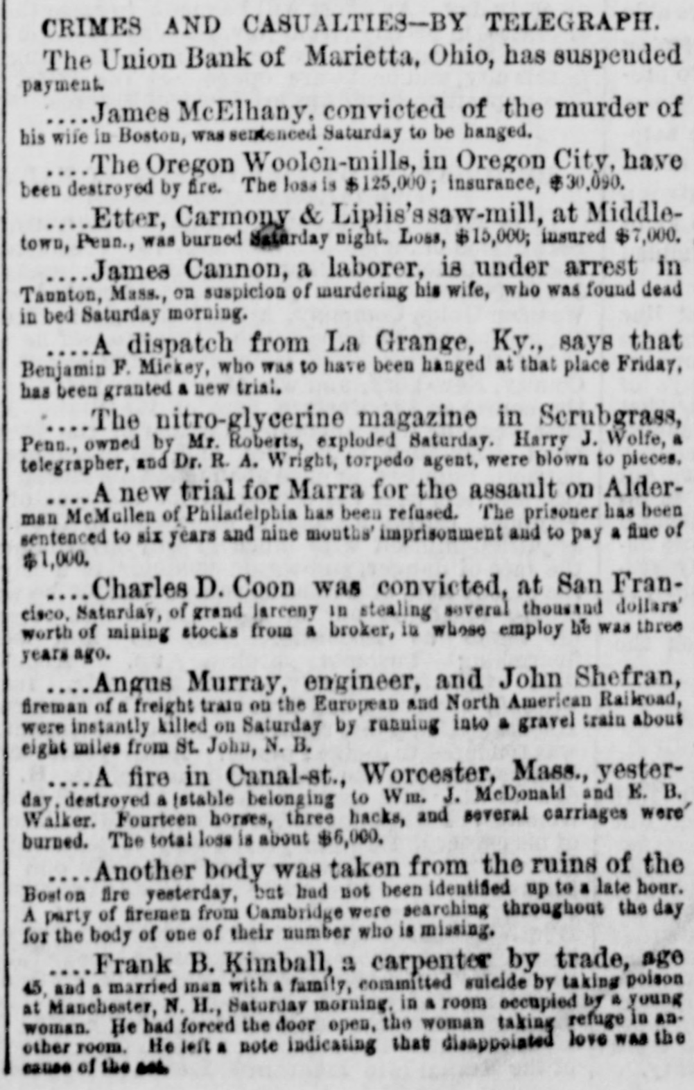 CRIMES AND CASUALTIES-BY TELEGRAPH. The Union Bank of Marietta, Ohio, has suspended payment. James McElhany, convicted of the murder of his wife in Boston, was sentenced Saturday to be hanged. The Oregon Woolen-mills, in Oregon City, have been destroyed by fire. The loss is $125,000; insurance, $30,090. Etter, Carmony & Liplis'ssaw-mill, at Middletown, Penn., was burned Saturday night. Loss, $15,000; insured $7,000. James Cannon, a laborer, is under arrest in Taunton, Mass., on suspicion of murdering his wife, who was found dead in bed Saturday morning. A dispatch from La Grange, Ky., says that Benjamin F. Mickey, who was to have been hanged at that place Friday, has been granted & new trial. The nitro-glycerine magazine in Scrubgrass, Penn., owned by Mr. Roberts, exploded Saturday. Harry J. Wolfe, a telegrapher, and Dr. R. A. Wright, torpedo agent, were blown to pieces. ....A new trial for Marra for the assault on Alderman McMullen of Philadelphia has been refused. The prisoner has been sentenced to six years and nine mouths' imprisonment and to pay a fine of $1,000. Charles D. Coon was convicted, at San Francisco, Saturday, of grand Jarceny in stealing several thousand dollars' worth of mining stocks from a broker, in whose employ be was three years ago. Angus Murray, engineer, and John Shefran, fireman of a freight trate on the European and North American Railroad, were instantly killed on Saturday by ranning into a gravel train about eight miles from St. John, N. B. A fire in Canal-st., Worcester, Mass., yesterday, destroyed a (stable belonging to Wm. J. McDonald and E. B. Walker. Fourteen horses, three hacks, and several carriages were burned. The total loss is about $6,000. Another body was taken from the ruins of the Boston fire yesterday, but had not been identified up to a late hour. A party of firemen from Cambridge were searching throughout the day for the body of one of their number who is missing. Frank B. Kimball, a carpenter by trade, age 45, and a married man with a family, committed suicide by taking poison at Manchester, N. H., Saturday morning. in a room occupied by a young woman. He had forced the door open, the woman taking refuge in another room. He left a note indicating that disappointed love was the cause of the w