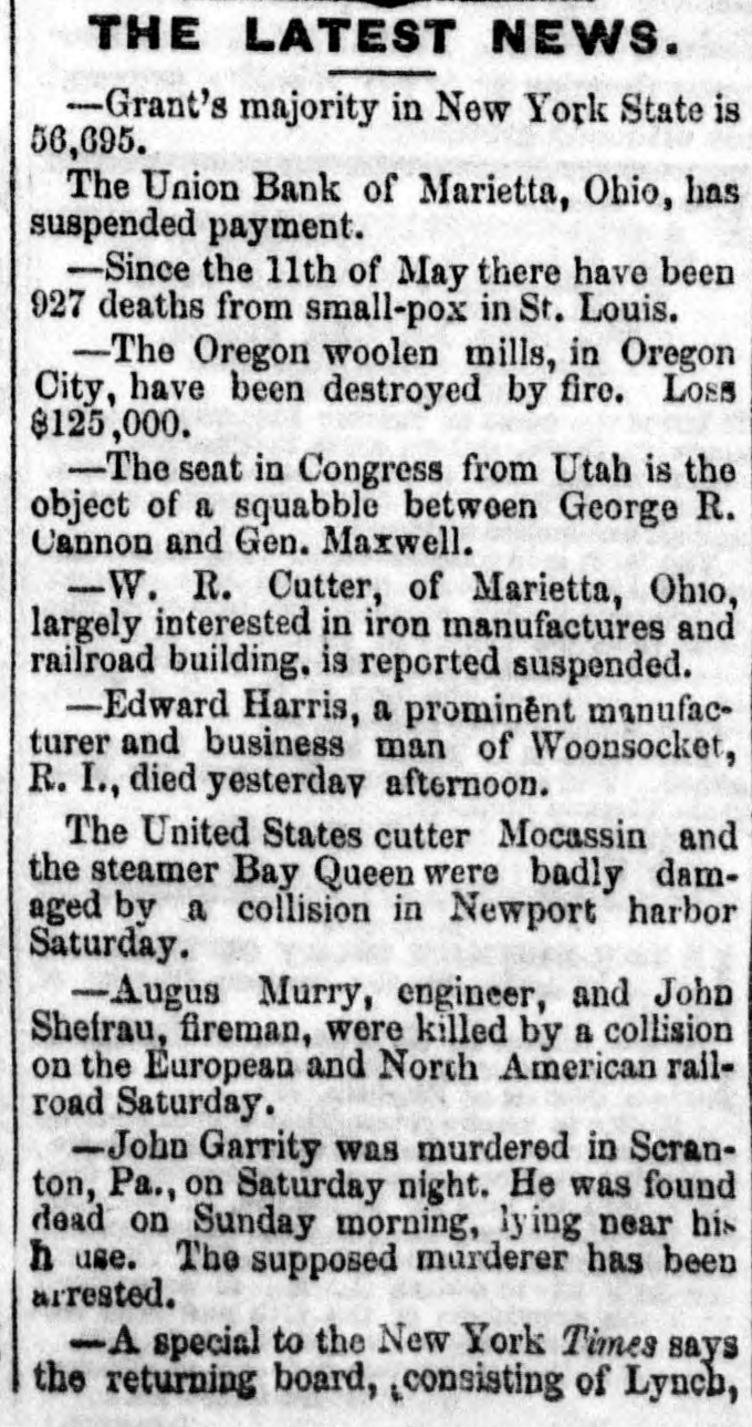 THE LATEST NEWS. -Grant's majority in New York State is 56,695. The Union Bank of Marietta, Ohio, has suspended payment. -Since the 11th of May there have been 927 deaths from small-pox in St. Louis. -The Oregon woolen mills, in Oregon City, have been destroyed by fire. Loss $125,000. -The seat in Congress from Utah is the object of a squabble between George R. Cannon and Gen. Maxwell. -W. R. Cutter, of Marietta, Ohio, largely interested in iron manufactures and railroad building. is reported suspended. -Edward Harris, a prominent manufacturer and business man of Woonsocket, R. I., died yesterday afternoon. The United States cutter Mocassin and the steamer Bay Queen were badly damaged by a collision in Newport harbor Saturday. -Augus Murry, engineer, and John Shefrau, fireman, were killed by a collision on the European and North American railroad Saturday. -John Garrity was murdered in Scranton, Pa., on Saturday night. He was found dead on Sunday morning, lying near his h use. The supposed murderer has been arrested. -A special to the New York Times says the returning board, consisting of Lynch,