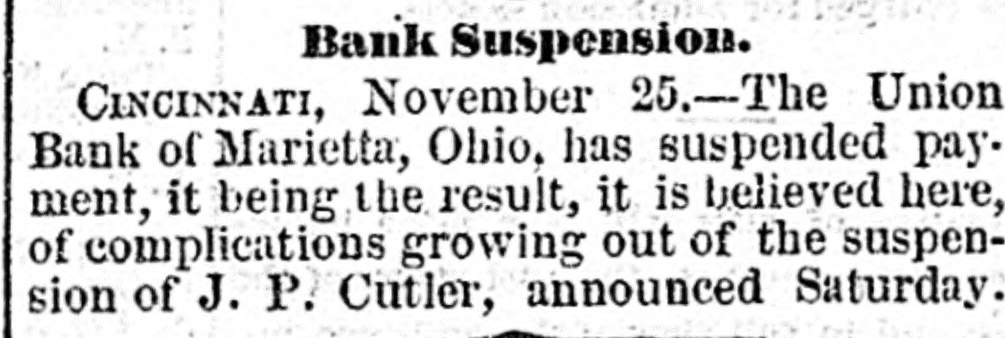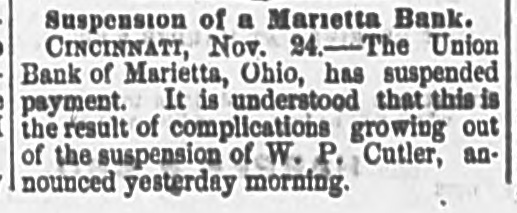 Suspension of a Marietta Bank. CINCINNATI, Nov. 24. - The Union Bank of Marietta, Ohio, has suspended payment. It is understood that this is the result of complications growing out of the suspension of W. P. Cutler, announced yesterday morning.