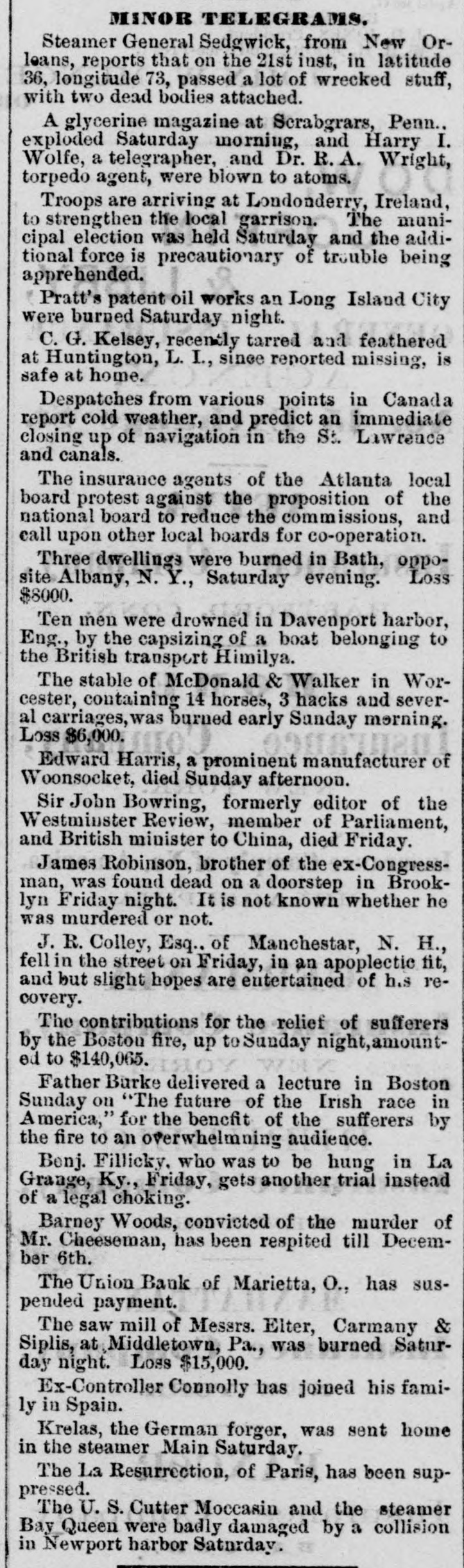 MINOR TELEGRAMS. Steamer General Sedgwick, from New Orleans, reports that on the 21st inst, in latitude 36, longitude 73, passed a lot of wrecked stuff, with two dead bodies attached. A glycerine magazine at Scrabgrars, Penn., exploded Saturday morning, and Harry I. Wolfe, a telegrapher, and Dr. R.A. Wright, torpedo agent, were blown to atoms. Troops are arriving at Londonderry, Ireland, to strengthen the local garrison. The municipal election was held Saturday and the additional force is precautionary of trouble being apprehended. Pratt's patent oil works an Long Island City were burned Saturday night. C. G. Kelsey, recently tarred and feathered at Huntington, L. I., since reported missing, is safe at home. Despatches from various points in Canada report cold weather, and predict an immediate closing up of navigation in the St. Lawrence and canals. The insurance agents of the Atlanta local board protest against the proposition of the national board to reduce the commissions, and call upon other local boards for co-operation. Three dwellings were burned in Bath, opposite Albany, N. Y., Saturday evening. Loss $8000. Ten men were drowned in Davenport harbor, Eng., by the capsizing of a boat belonging to the British transport Himilya. The stable of McDonald & Walker in Worcester, containing 14 horses, 3 hacks and several carriages, was burned early Sunday morning. Loss $6,000. Edward Harris, a prominent manufacturer of Woonsocket, died Sunday afternoon. Sir John Bowring, formerly editor of the Westminster Review, member of Parliament, and British minister to China, died Friday. James Robinson, brother of the ex-Congressman, was found dead on a doorstep in Brooklyn Friday night. It is not known whether he was murdered or not. J. R. Colley, Esq.. of Manchestar, N. H., felli in the street on Friday, in an apoplectic fit, and but slight hopes are entertained of his recovery. The contributions for the relief of sufferers by the Bostou fire, up to Sunday night,amounted to $140,065. Father Barke delivered a lecture in Boston Sunday on "The future of the Irish race in America," for the benefit of the sufferers by the fire to an overwhelmning audience. Benj. Fillicky. who was to be hung in La Grange, Ky., Friday, gets another trial instead of a legal choking. Barney Woods, convicted of the murder of Mr. Cheeseman, has been respited till December 6th. The Union Bank of Marietta, O., has suspended payment. The saw mill of Messrs. Elter, Carmany & Siplis, at Middletown, Pa., was burned Saturday night. Loss $15,000. Ex-Controller Connolly has joined his family in Spain. Krelas, the German forger, was sent home in the steamer Main Saturday. The La Resurrection, of Paris, has been suppressed. The U.S. Cutter Moccasin and the steamer Bay Queen were badly damaged by a collision in Newport harbor Saturday.
