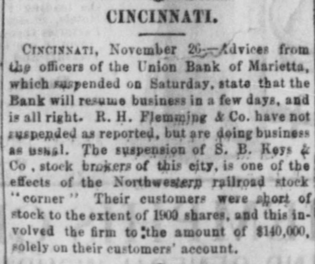 CINCINNATI. CINCINNATI, November 26-Advices from the officers of the Union Bank of Marietta, which suspended on Saturday. state that the Bank will resume business in a few days, and is all right. R. H. Flemming & Co. have not suspended as reported, but are doing business as usual. The suspension of S. B. Keys Co stock brokers of this city, is one of the effects of the Northwestern railroad stock "corner" Their customers were short of stock to the extent of 1900 shares. and this involved the firm to "the amount of $140,000. solely on their customers' account.