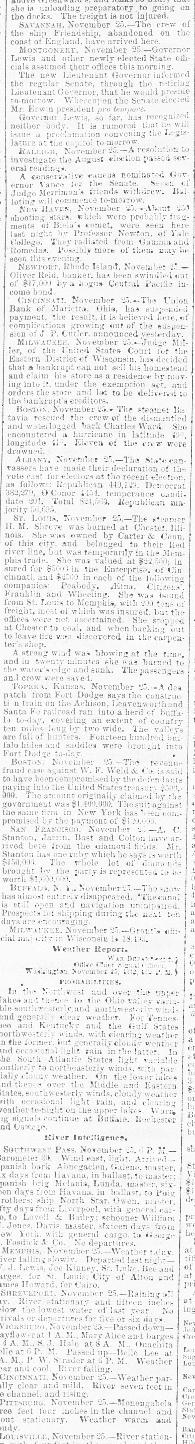 on she is unloading preparatory to going the docks The freight is not injured SAVANN H November 25.-The crew of the ship Friendship, abandoned on the coast of England, have arrived here MONTGOMERY November -Governor Lewis and other newly elected State offi cials assumed their offices this morning The new Lieuten Governor the regular Senate, through the retiring Lieutenant Governor that lie would preside the Senate elected Mr. Erwin president has far. so Gove neither body It rumored that convening the morro lature resolution to A RALEIGH investigate the August election passed ser eral reading A conservative caueus nominated Gov Senate the Vance Judge ernor Merrimon friends withdrew. Bal to-morrow loting NEW 11 AVEN November 25.- About shooting stars which were prob seen Biela were comet, ments of last night Professor Newton of College. 1 radiated from 1 anna Romedas Possibly more of them may be this 800L NEWPORT Rhode Island November swindled Oliver Reid banker. has been of $17,000 by a bogus Centr 1. Pacific in come bond CINCINN November 25 -The Union Bank of Marietta, Ohio. has payment the result it is belie red here complica growing out of the suspen sion Cutler announced vesterday MilMILWAUKEE November Judge ler, of the United States Court for the Eastern District of Wisconsin, has decided that a bankrup cap not sell his homester and claim his store as a residen by mov into under the exemption act. and orders the store and let to be delivered the bankrup BOSTON November The steamet Ba tavia rescued the crew of the and waterlogged Dark Charlee Ward She a in latitude hurricane encountered longitude 410 Eleven of the crew were drowned ALBANY. November 25.- The State er vassers made their declaratic of the vote east recen as follo Republican 440.129 Democrat o Conor 1454. temperance candidate 201. Total 824,5 b. Republican ma jority ST. LOUIS. November 2: The steamer H. M Shreve was burned at Chester Illi nois. She was owned by Carter & Conn of this city and belonged to their Red river line. temporarily in the Mem phistrade She was valued at $ Cin sured for the Enterprise cinnati and in each of the following /Etna. Peabody. Citizens companies and Wheeling. She was bound from St Louis to Memphia, with 200 ton freight of which was insured but the offices rtained She coal. at Chester to and when backing to leave fire was discovered in the carpen ter shop. A strong wind was blowing at the time and in twenty minutes she was burned and sunk. The passedget crew an TOPEE ansas. November of des patch from Fort Dodge says the construe n on the Achison Leavenw and Santa railroad ran into a herd of buffa an of extent ten The wide. miles are Fourteen hundred falo hides and saddles were brought into Fort Dods fraud against W.F. Weld & by the to ha United paying 000. 400,000. The New York $120 of payment SAN November Bast and Colton diamond the Stanton which whole is party represented November shipping during November Wisconsin 18 Weather Report PROBABILITIES. In and Ohio weather Kentuck and the the and in rain the In he light States On weather. the ially nd Middle and tates ith rain, eather ester at Buffalo nd Osw River Intelligence. si P November SOUTHWEST light Wind east, Galene egacion. t in days ballast Havana, panis Melania, Lunda maste on days Havana in ballast. to Puis Star Owen. North ty with to 11 iam Bailey schooner sixteen day master, Weather rainy Departed Kinney of Alton and City and inc of last Alice Mary and barges S.A. Hale at M Quachita Passed at A Lo M Strader P M. Weather cool falling Nev November Weather parlly Car clear and mild. River seven feet in rising 0 channel November Monongahela ree Ne feet four inches in the chann and out stationary Weather warm and udy Bar November River station