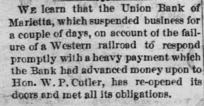 WE learn that the Union Bank of Marietta, which suspended business for a couple of days, on account of the failure of a Western railroad to respond promptly with a heavy payment which the Bank had advanced money upon to Hon. W. P. Cutler, has re-opened its doors and met all its obligations.