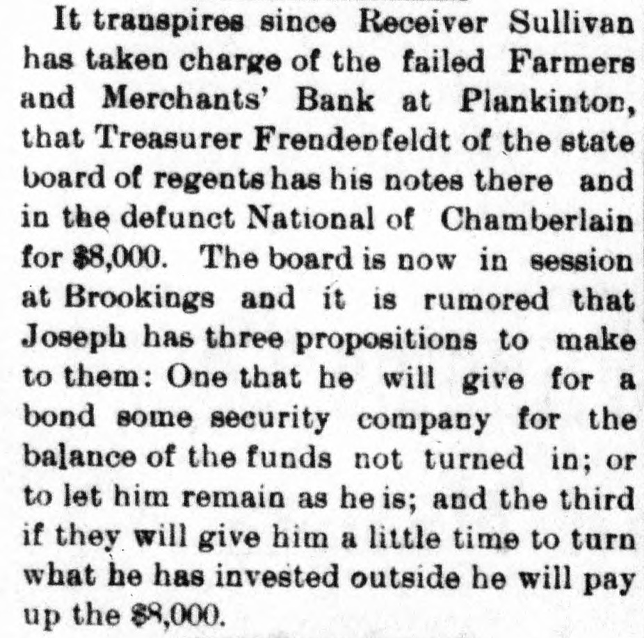 negroes and robbed of $7,500. COMMANDER WHITING, of the Alliance, and Miss Etta Ah Fong, of Honolulu, will be married in December. WHILE bathing in Rock River, near Rock Island, Ill., C. H. Bufordand Miss Fannie Sudlow were drowned. THE Chinese six companies will ask a rehearing before the United States supreme court of the Geary law case. THE courts have knocked out the Nebraska maximum rate law as practically confiscating all railroads in the state. SUIT for $1,900,000 for violation of contract has been brought by the Wiggins Ferry Company against the Alton road. A. G. MORGAN, Lexington, Ky., is made disbursing clerk of the bureau of engraving and printing at $2,000 per year. SENATOR HILL delivered an addresson "Personal Liberty" at the pienic of the Hop-Growers' Association at Rome, N.Y. FOURTEEN persons have been arrested charged with the murder of S. P. Bradshaw at Kingston, III. It was a whitecap outrage. THE British warship Triumph sailed from Malta for Portsmouth on Saturday with 300 survivors of the Victoria disaster on board. MATE GREENLEAF, of the ship Crapo, murdered a sailor on the voyage from Hong Kong to Boston. He avoided the Boston officers. IN attempting to release his impounded cows near Louisville, Edwin Graham shot Marshal A. J. Blunt and was in turn killed by the officer. MONTREAL'S mayor refuses to take part in a reception to officers of an Italian warship because the government is under the ban of the Vatican. Gov. WAITE, of Colorado, and Reporter Gaston had a hand to hand fight in Denver, the Governor attempting to eject Gaston from the executive office. SUIT is brought at St. Paul by the Metropolitan Trust Company of New York to foreclose a $3,220,000 mortgage on the Wisconsin, Minnesota & Pacific road. A STORY is told in connection with the failure of the Elmira National Bank, of Elmira, N. Y. After the failure, three notes aggregating $54,000 turned up among the assets. They were signed by three bank clerks without means and are worthless. Gov. FISHBACK, of Arkansas, is seriously ill. THE New York mills at Saco will shut down for five weeks. NEW ORLEANS-Chicago round trip rates have been cut to $12. FIVE persons committed suicide at New York on July 28. MINNESOTA Catholics gave a reception at St. Paul to Mgr. Satolli. STATE troops are under arms at Denver and sleep in the armory. THE Chamberlain National Bank. of Chamberlain, S. D., has failed. THE rail rate from New York to Chicago, first class, has been cut to $10. TREMONT and Suffolk mills at Lowell, Mass., will be operated on half time. THE Union Bank of Portland, Ore., has suspended. It is asmall concern. GEN. J. H. WALLACE, the well-known Union soldier, died at Ottawa, III., aged 67 years. FOUR cases of cholera and three deaths are reported at Naples in twentyfour hours. REPRESENTATIVE LYNCH is the first Wisconsin congressman to arrive in Washington. J. B. KILBRETH has been made collector and W. Y. Bunn appraiser at New York City. FIRE swept over the Catholic cemetery at Paterson, N. J., damaging many costly monuments. FULLY 200 people were made homeless by the flood at Pueblo, Col. The loss reaches $250,000. THE Union Indurated Fiber Company's works at Lockport burned. Loss, $80,000 to $100,000. THE Missouri authorities will prevent idle miners, coming east from Colorado, entering the former state. T. HARPER, colored, was lynched at Celera, Ala., because of an attempted assault on a white woman. THE E. W. Chapin Company, at Northboro, Mass., has assigned, owing $50,000. The company makes satinets. THE Louisville Clearing House Association decides to issue clearing house certificates to aid weak banks. CHARLES SNIDER, a young farmer of Hancock County, Ia., has mysteriously disappeared. Foul play is feared. IT is said that the refuse from the paper mill at Wabash, Ind., is killing thousands of fish in the Wabash River. C. W. CHOPIN & Co's bank at Stanton, Mich., closed with a crowd of depositors at the doors. No statement is made. DR. JOHNSON, of Chattanooga, charged with killing Chief of Police Mitchell, has been released. THE Emperor of Germany has gone to the Isle of Wight, where he will meet the Prince of Wales. H. A. BRINK shot J. Ray dead at Gutherie, O.T., because he would not
