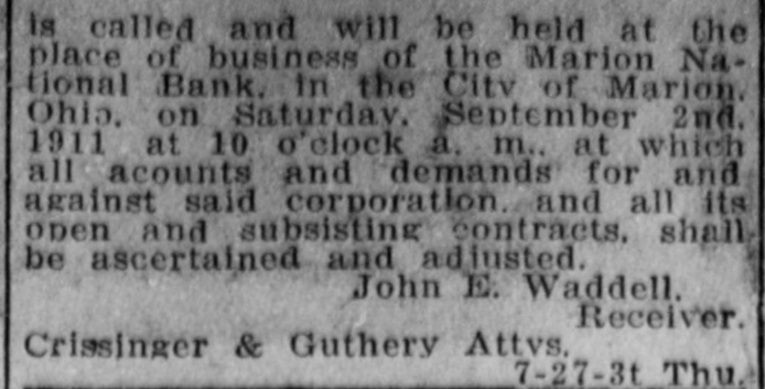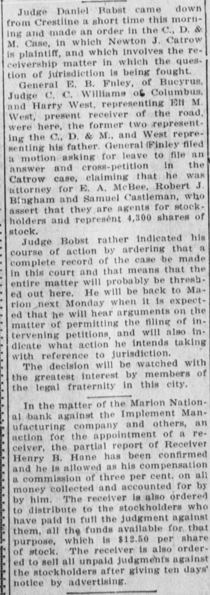 Judge Daniel Babst came down from Crestline a short time this morning and made an order in the C., D. & M. Case, in which Newton J. Catrow is plaintiff, and which involves the receivership matter in which the question of jurisdiction is being fought. General E. B. Fnley, of Bucyrus, Judge C. C. Williams of Columbus, and Harry West, representing Ell M. West, present receiver of the road, were here, the former two representing the C., D. & M., and West representing his father. General (Finley filed a motion asking for leave to file an answer and cross-petition in the Catrow case, claiming that he was attorney for E. A. McBee, Robert J. Bingham and Samuel Castleman, who assert that they are agents for stockholders and represênt 4,300 shares of stock. Judge Bobst rather indicated his course of action by ardering that a complete record of the case be made in this court and that means that the entire matter will probably be threshed out here. He will be back to Marion next Monday when it is expected that he will hear arguments on the matter of permitting the filing of intervening petitions, and will also indicate what action he intends taking with reference to jurisdiction. The decision will be watched with the greatest interest by members of the legal fraternity in this city, In the matter of the Marion National bank against the Implement Manufacturing company and others, an action for the appointment of a receiver, the partial report of Receiver Henry B. Hane has been confirmed and he is allowed as his compensation a commission of three per cent. on all money collected and accounted for by by him. The receiver is also ordered to distribute to the stockholders who have paid in full the judgment against them, all the funds available for that purpose, which is $12.50 per share of stock. The receiver is also ordered to sell all unpaid judgments against the stockholders after giving ten days' notice by advertising.