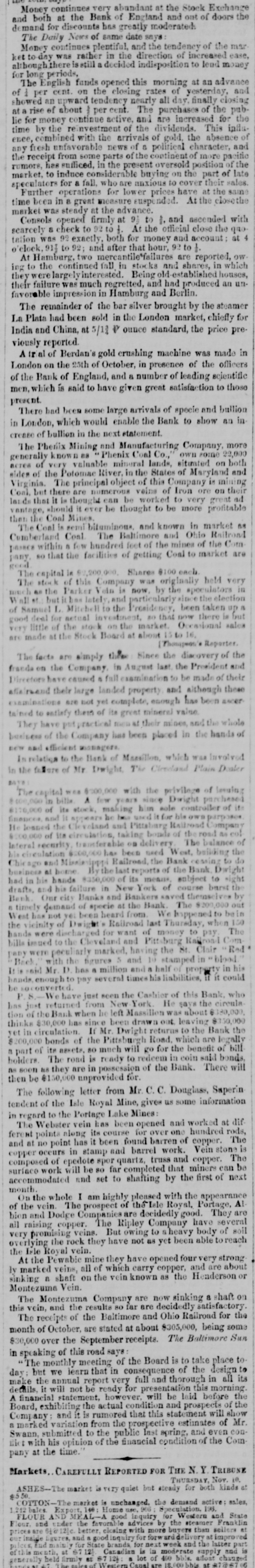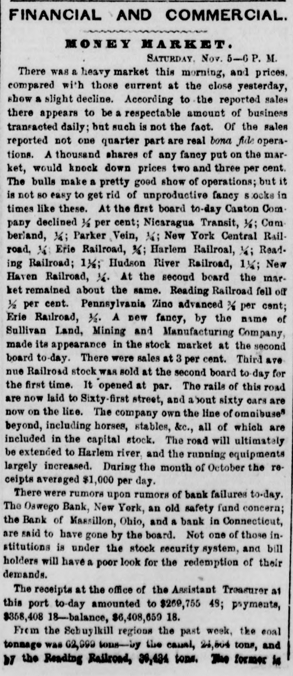 FINANCIAL AND COMMERCIAL. MONEY MARKET. SATURDAY. Nov. 5-6 P. M. There was a heavy market this morning, and prices. compared with those current at the close yesterday, show a slight decline. According to the reported sales there appears to be a respectable amount of business transacted daily; but such is not the fact. Of the sales reported not one quarter part are real bona fide operations. A thousand shares of any fancy put on the market, would knock down prices two and three per cent. The bulls make a pretty good show of operations; but it is not 80 easy to get rid of unproductive fancy ocks in times like these. At the first board to-day Canton Com. pany declined 1/2 per cent; Nicaragua Transit, 1/2; Cumberland, 1/4; Parker Vein, 14; New York Central Railroad, 1/4 Erie Railroad, 1/2; Harlem Railroal, 1/4; Reading Railroad; 1 1/2; Hudson River Railroad, 11/4; New Haven Railroad, 14. At the secoud board the market remained about the same. Reading Railroad fell off 1/2 per cent. Pennsylvania Zino advanced 1/4 per cent; Erie Railroad, 1/2. A new fancy, by the name of Sullivan Land, Mining and Manufacturing Company, made its appearance in the stock market at the second board to-day. There were sales at 3 per cent. Third ave nue Railroad stock was sold at the second board to-day for the first time. It opened at par. The raile of this road are now laid to Sixty-first street, and about sixty cars are now on the line. The company own the line of omoibuse beyond, including horses, stables, &c., all of which are included in the capital stock. The road will ultimately be extended to Harlem river, and the running equipments largely increased. During the month of October the receipts averaged $1,000 per day. There were rumora upon rumors of bank failures to-day. The Oawego Bank, New York, an old safety fund concern; the Bank of Massillon, Ohio, and a bank in Connecticut, are said to have gone by the board. Not one of those institutions is under the stock security system, and bill holders will have a poor look for the redemption of their demands. The receipts at the office of the Assistant Treasurer a1 this port to-day amounted to $269,755 48; payments, $358,408 18-balance, $6,408,659 18. From the Schuylkill regions the past week, the coal tonnage was 62,999 tons-by the cauni, 24,604 tons, and by the Reading Railroad, 36,434 tons. The former in
