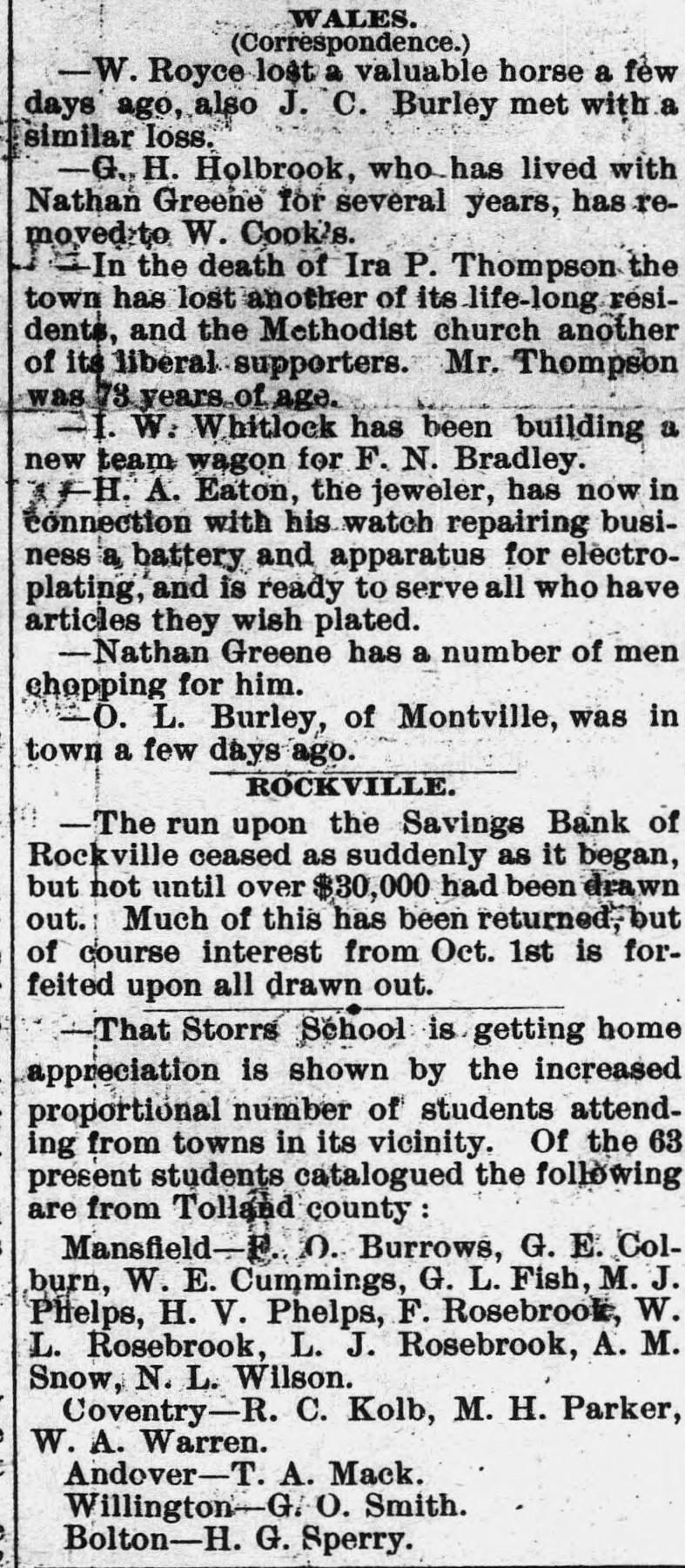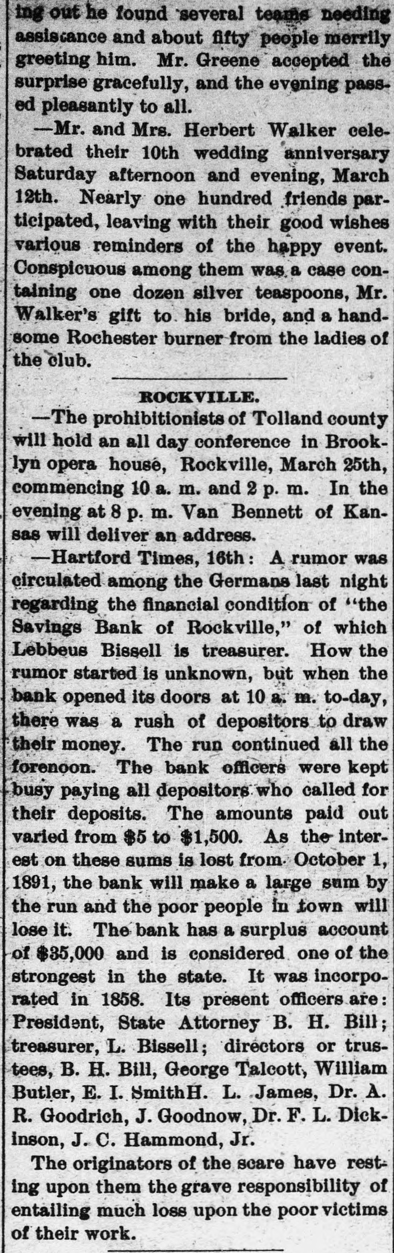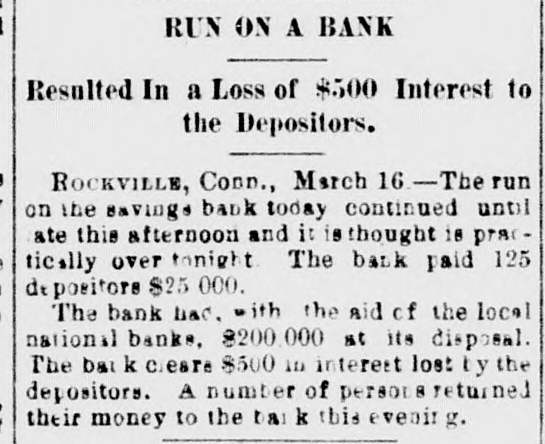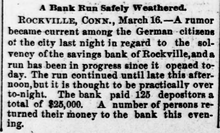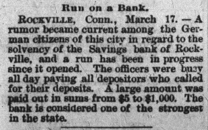 A run on the Savings Bank of Rockville, Conn., was started Thursday by rumors as to its condition. A large amount was paid out to depositors. The bank is considered one of the strongest in the state.