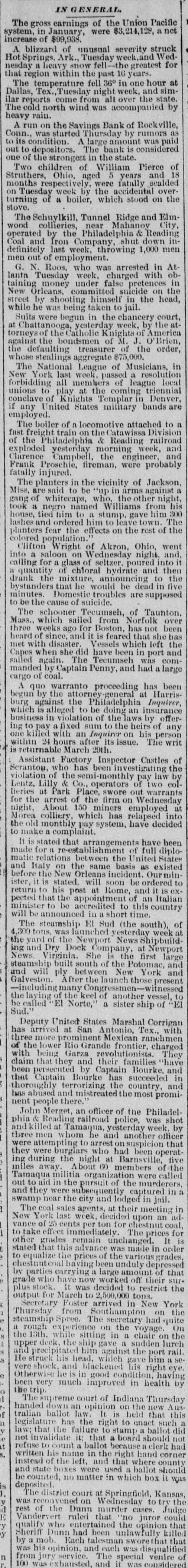 John Merget, an officer of the Philadelphia & Reading railroad police, was shot and killed at Tamaqua, yesterday week, by three men whom he and another officer were attempting to arrest on suspicion that they were burglars who had been operating during the night at Barnsville, five miles away. About 60 members of the Tamaqua militia organization were called out to aid in the pursuit of the murderers, and they were subsequently captured in a swamp near the city and lodged in jail.