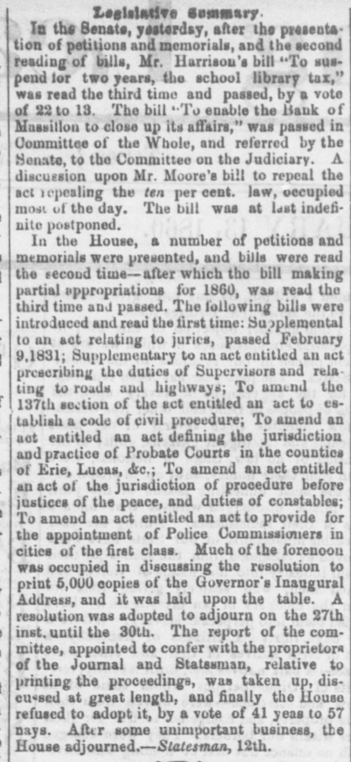 Logislative Summary. In the Senate, yesterday, after the presentation of petitions and memorials, and the second reading of bills, Mr. Harrison's bill "To suspend for two years, the school library tax," was read the third time and passed, by a vote of 22 to 13. The bill "To enable the Bank of Massitlon to close up its affairs," was passed in Committee of the Whole, and referred by the Senate, to the Committee on the Judiciary. A discussion upon Mr. Moore's bill to repeal the act repealing the ten per cent. law, occupied most of the day. The bill was at last indefinite postponed. In the House, a number of petitions and memorials were presented, and bills were read the second time-after which the bill making partial appropriations for 1860, was read the third time and passed. The following bills were introduced and read the first time: upplemental to an act relating to juries, passed February 9,1831; Supplementary to an act entitled an act prescribing the duties of Supervisors and relating to roads and highways; To amend the 137th section of the act entitled an act to establish a code of civil procedure; To amend an act entitled an act defining the jurisdiction and practice of Probate Courts in the counties of Erie, Lucas, &c.; To amend an act entitled an act of the jurisdiction of procedure before justices of the peace, and duties of constables; To amend an act entitled an act to provide for the appointment of Police Commissioners in cities of the first class. Much of the forenoon was occupied in discussing the resolution to print 5,000 copies of the Governor's Inaugural Address, and it was laid upon the table. A resolution was adopted to adjourn on the 27th inst. until the 30th. The report of the committee, appointed to confer with the proprietora of the Journal and Statssman, relative to printing the proceedings, was taken up, discussed at great length, and finally the House refused to adopt it, by a vote of 41 yeas to 57 nays. After some unimportant business, the House adjourned.-Statesman, 12th.