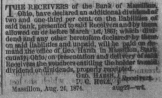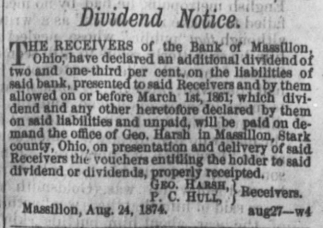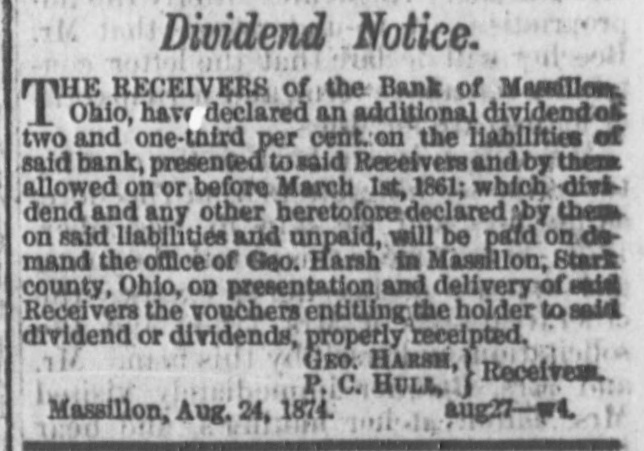 Dividend Notice. the Bank of Massillom. an additional dividendos two and one-third per cent. on the liabilities of said bank, presented to said Receivers and by them allowed on or before March Ist, 1861; which dividend and any other heretofore declared by them on said liabilities and unpaid, will be paid on demand the office of Geo. Harsh in Massillon, Stark county, Ohio, on presentation and delivery of said Receivers the vouchers entitling the holder to said dividend or dividends, properly receipted. GEO. HARSH, Receivem. P.C. HULL, aug27-w4. Massillon, Aug. 24, 1874.