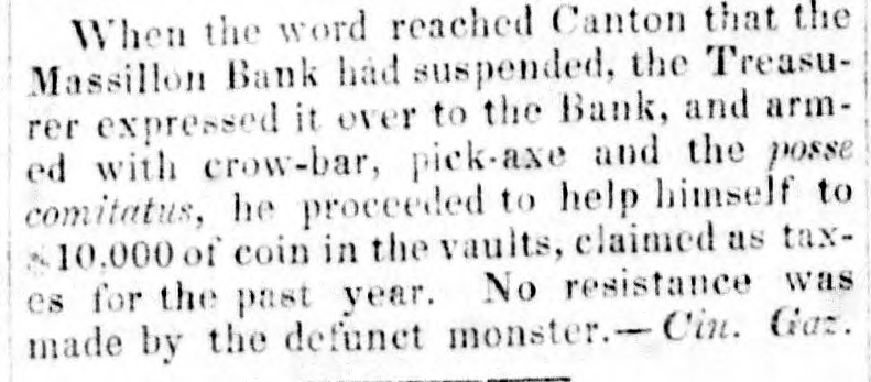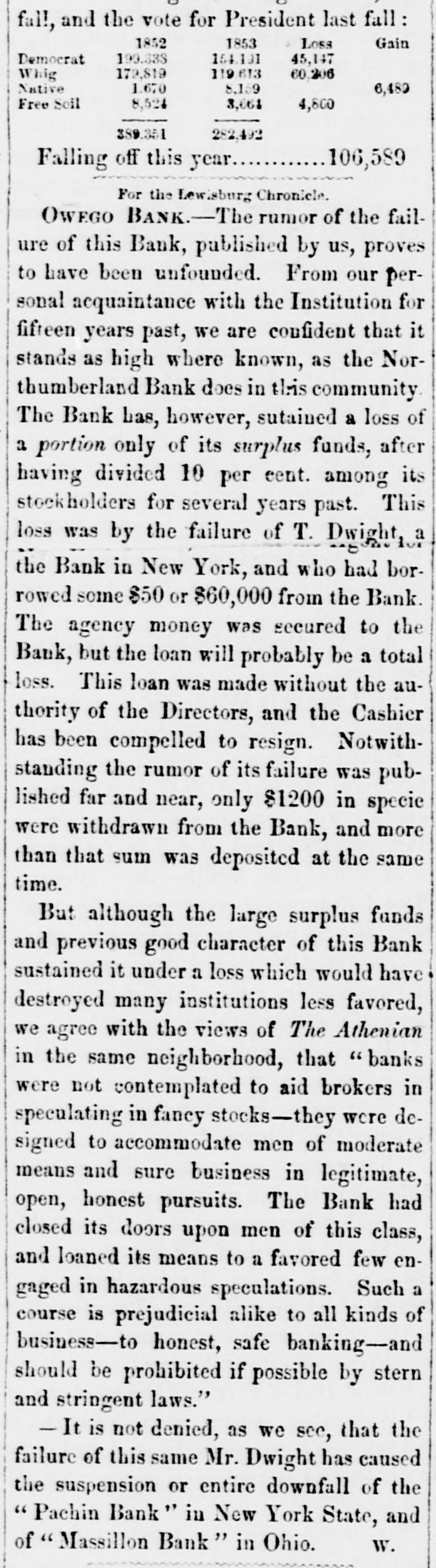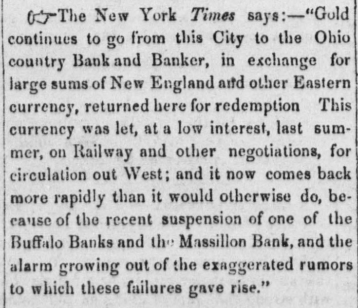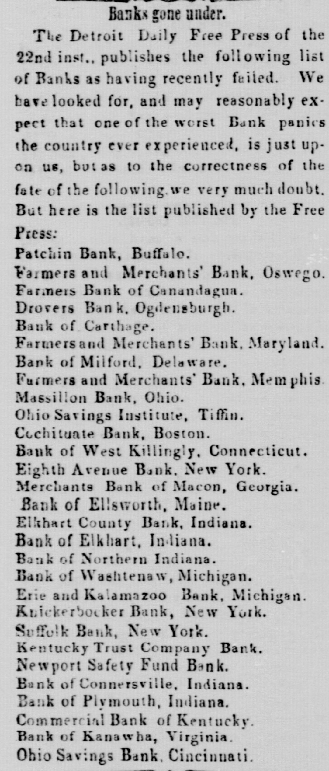 with the important subthought, is relations fully impressed which must this city, hereafter and he commercial Minnesota and of our as an excellent of the Upper with Nov. very sist between leading the Minnesotian wisely business making men. the people the We acquaintance commend medium 1st. them of com- Misof munication Chicago Dem. Press, opportunity sissippi.- the first convenient to our We take ledging our indebtedness as well as publicly acknow the 'Press for the above, attention, friends of kindly acts of personal sojourn in the many shown other us during our recent Press short is in its infancy, through the comparatively- Garden City.' The energy, only tact fourteen and perseve- months it has old but competent proprietors, maintain, rence already of assumed, its very and of is the fully leading able to commercial Its the position of the of one North-West. business interests of motto is, manufacturing and As the and political the journals agricultural the Minneso- country -commercial, party politics second. the same printian -first, acts and is conducted wel' recognize upon in our such Chicaciple, we can mutual very cu-laborers, and Press' as " to take all go friends recommending the from pleasure in readable and reliable journal who wish flourishing a commercial emporium. that for St. Louis some t NEW YORK.- We but started rather unexpectedly, kindly and few weeks ago, the solicitations and perhaps owing to accommodating gentleman, and Norproffers of that very the Michigan Southern the wrong Capt. Gray. of we took and in about forty thern train Indiana Chicago, Railroad, hours, hustled Broad- travat were being jammed crowd and of through eling time, the ever teeming visit busy to the great metropway. It was our ; and as we had were to business to days olis of our remain, important country and, first so long as we transact, elephant.' but there. very two or some very was allowed to 'see the forth in yellittle time the giraffe, so gaudily from set the windows ochre and we even low Museum. Spanish brown Neverthelese, arriv- put of Barnum's to the best advantage, York and soon is a place ed in time' at the conclusion considerable that New note-a great to St. place Paul. equal appeared to worthy in fact-fully of particular in time, some they respects politics to asgreat ulti- be At that and striving about prospect of wrangling and with as little in Minan extent, weare continually doing the largmate profit, as we think we have much of great men here, in the advent at least have had of its attendant nesota. lar-or number Still, and some since this particu- equal. ex- of the past summer nothing in New York to But in less surpass us to some the palm to the otics. much other We concede saw regards, not in necessary this respect. PRESSURE.- EmpireCity specify, The we must THE LATE MONEY has comEFFECTS OF the money market East effects are pressure in relaxed, but the ordinary permanent paratively outside. in the failure, banks. The now or temporary, visible of sundry country gives the following I Chicago Press of the of facts. 9th, In addition brought to this, list and statement by the Clarion on Thursday by any res passengers unauthenticated to us other information, authority. of the failure of sundry Safety ponsible banks, including all the New York Fund institutions few Within days Ohio. the RECENT failure BANK of the FAILURES. following Banks has been allnounced: Massilion Bank Patchin Buffalo. N.Y, Chatauque Pratt Co. Bank Lewis Co. Bank of Owego Joint Stock Bank, Canada. of the failure of current on the Rumors more or less trace them banks were Farmers were unable two to or three regard street other to yesterday, but we and are inclined to date. In authentic sources list as full up to the present named. several the above the Banks above been cemaddition to eastern operators have by the stringency liabilities. of to prominent pelled the money suspend market and extent of their shortly, also may some of event of course we will noSome so and the of them such all may come the banks, up again but of parties know the probability of For the present. banks. thing in refusing the Patchin Banks Webelieve be safe positively. the Pratt and bills of the above holders are of in public stocks, if regard so, to the their bills will lose serious doubts men Owego announcing both secured Bank, our we most hear nothing. intelligent In business expressed to the correctnes of the bills of this will to a large as by its suspension some probably of await holders more of the definite report shave. information We bank may with respect to the West, so far as that their and, even in state before submitting circulation at all the discredited the banks. worst we know, TheOwego point of consequence is view, quite but limited little of theirfailure. will be exceptions lost by our to peo- this in Massillon Banks may to be be owned chiefly on Monday remark. Dwight. as they Jr., are whose suspension we and ple Henry said morning. ventures to say an- by The N. Y. Tribune that the specie even nounced "it is believed checked. of the and 5th some parties shipments to Europe are with cotton and feel confident that, we shall import going that, abroad before freely, spring. have breadstuffs coin hastily from England In view of facts such we as we see no cause for alarm grouped in together the future, above, but much for self-gratulation. JOURNAL.- We are indebted journal to the for CHICAGO of this substantial Whig for our publishers in exchange their tri-weekly making sending us We hope to reciprocate meantime by we weekly. in a few months in remind Minnesotians that no in all takes a deeper to the present and future Its entire would things country equal interest prosperity press neat that the of pertains than does the Journal. of its our and Territory healthful appearance is a guaranty