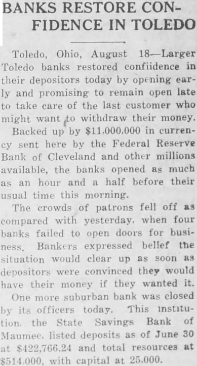 BANKS RESTORE CONFIDENCE IN TOLEDO Toledo, Ohio, August 18-Larger Toledo banks restored confiidence in their depositors today by opening early and promising to remain open late to take care of the last customer who might want to withdraw their money. Backed up by $11,000,000 in currency sent here by the Federal Reserve Bank of Cleveland and other millions available, the banks opened as much as an hour and a half before their usual time this morning. The crowds of patrons fell off as compared with yesterday, when four banks failed to open doors for business, Bankers expressed belief the situation would clear up as soon as depositors were convinced they would have their money if they wanted it. One more suburban bank was closed by its officers today. This institution. the State Savings Bank of Maumee. listed deposits as of June 30 $422,766.24 and total resources at $514,000, with capital at 25.000.