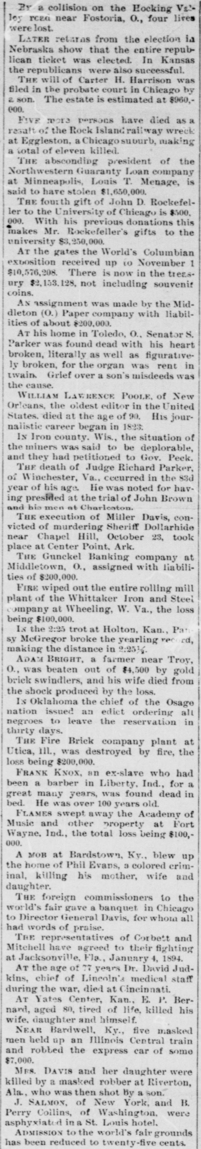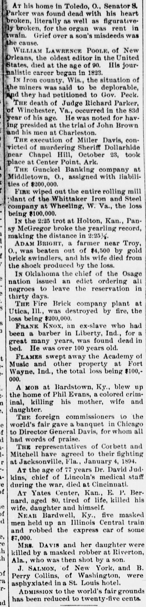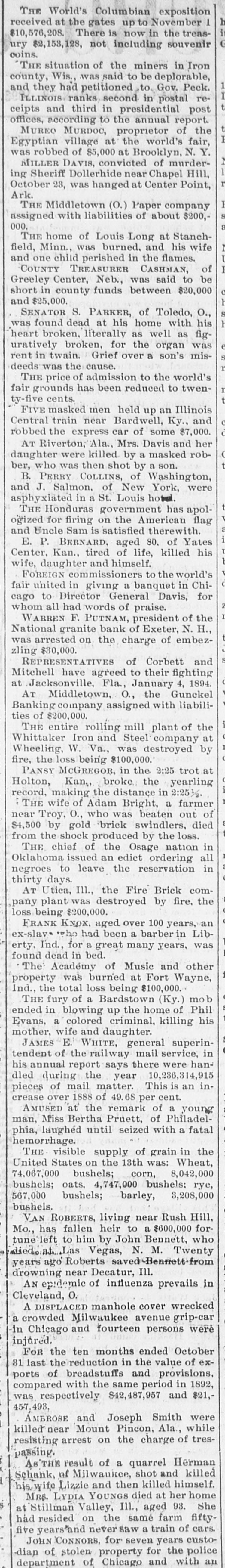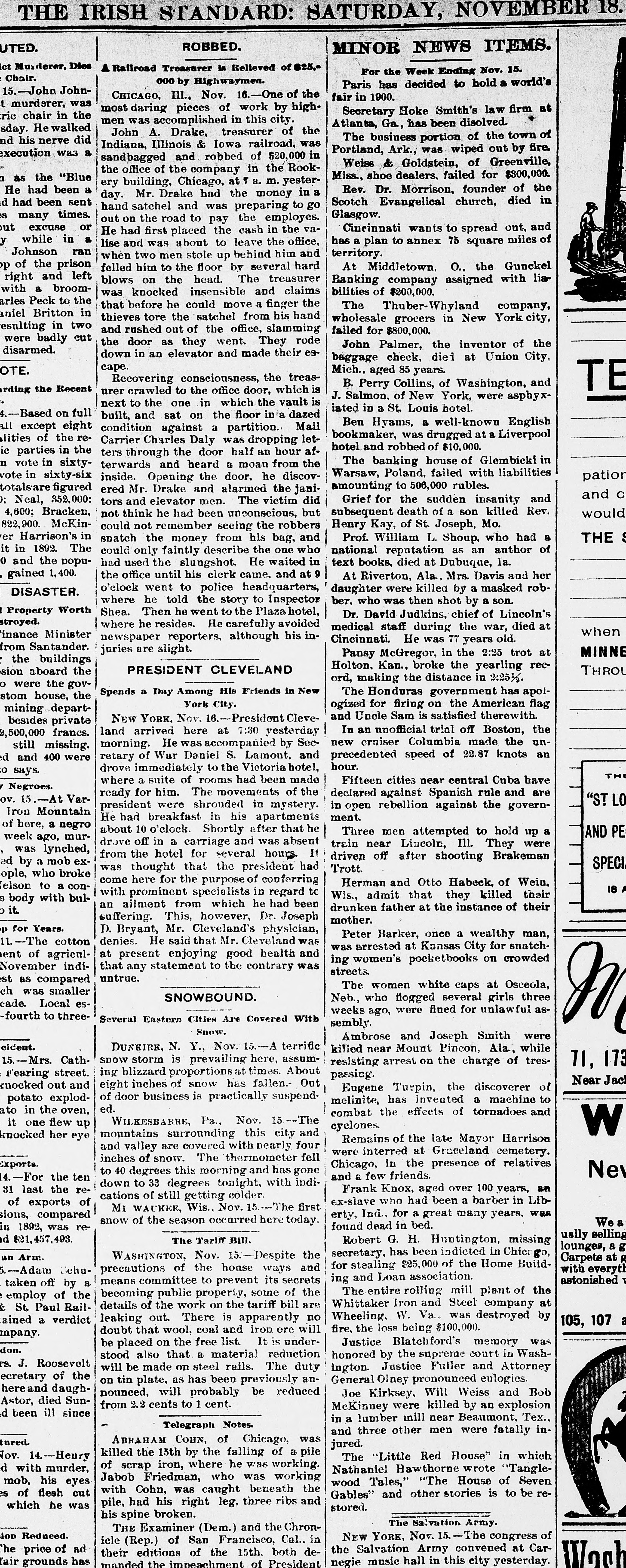 IRISH STANDARD: SATURDAY, NOVEMBER ROBBED. MINOR NEWS ITEMS. Dies A Railroad Treasurer is Relieved of 825,For the Week Ending Nov. 15. 000 by Highwaymen. Paris has decided to hold a world's JohnCHICAGO, Ill., Nov. 16.-One of the fair in 1900. was most daring pieces of work by highSecretary Hoke Smith's law firm at the in men was accomplished in this city. Atlanta, Ga, has been disolved. John A. Drake, treasurer of the The business portion of the town of did Indiana, Illinois & Iowa railroad, was Portland, Ark., was wiped out by fire. a was sandbagged and robbed of $20,000 in Weiss & Goldstein, of Greenville, the office of the company in the RookMiss., shoe dealers, failed for $300,000. "Blue ery building, Chicago, at , a. m. yestera been Rev. Dr. Morrison, founder of the day. Mr. Drake had the money in a sent Scotch Evangelical church, died in hand satchel and was preparing to go times. Glasgow. out on the road to pay the employes. or Cincinnati wants to spread out, and He had first placed the cash in the vaa in has a plan to annex 75 square miles of lise and was about to leave the office, ran territory. when two men stole up behind him and prison felled him to the floor by several hard At Middletown. O., the Gunckel left blows on the head. The treasurer Banking company assigned with liabroomwas knocked insensible and claims bilities of $200,000. to the that before he could move a finger the The Thuber-Whyland company, in thieves tore the satchel from his hand wholesale grocers in New York city, two and rushed out of the office, slamming failed for $800,000. cut the door as they went. They rode John Palmer, the inventor of the down in an elevator and made their esbaggage check, died at Union City, cape. Mich., aged 85 years. Recovering consciousness, the treasB. Perry Collins, of Washington, and Recent urer crawled to the office door, which is T J. Salmon. of New York, were asphyxnext to the one in which the vault is iated in a St. Louis hotel. full on built, and sat on the floor in a dazed Ben Hyams, a well-known English eight condition against a partition. Mail bookmaker, was drugged at a Liverpool the reCarrier Charles Daly was dropping lethotel and robbed of $10,000. the in ters through the door half an hour afThe banking house of Glembicki in sixtyterwards and heard a moan from the Warsaw, Poland, failed with liabilities pat inside. Opening the door. he discovamounting to 506,000 rubles. figured ered Mr. Drake and alarmed the janiand Grief for the sudden insanity and tors and elevator men. The victim did racken, subsequent death of a son killed Rev. not think he had been unconscious, but wo McKinHenry Kay, of St. Joseph, Mo. could not remember seeing the robbers in Prof. William L. Shoup, who had a TH snatch the money from his bag, and The national reputation as an author of could only faintly describe the one who poputext books, died at Dubuque, Ia. had used the slungshot. He waited in 400. the office until his clerk came, and at 9 At Riverton, Ala., Mrs. Davis and her o'clock went to police headquarters, daughter were killed by a masked robwhere he told the story to Inspector ber, who was then shot by a son. Worth Shea. Then he went to the Plaza hotel, Dr. David Judkins, chief of Lincoln's where he resides. He carefully avoided medical staff during the war, died at wh inister newspaper reporters, although his inCincinnati He was 77 years old. juries are slight. MIN Pansy McGregor, in the 2:25 trot at ildings Holton, Kan., broke the yearling recPRESIDENT CLEVELAND the THE ord, making the distance in 2:25 1/2. govSpends a Day Among His Friends in New The Honduras government has apolthe York City. ogized for firing on the American flag departand Uncle Sam is satisfied therewith. NEW YORK. Nov. 16.-President CleveIn an unofficial trial off Boston, the land arrived here at 7:30 yesterday francs. new cruiser Columbia made the unmorning. He was accompanied by Secissing. were precedented speed of 22.87 knots an retary of War Daniel S. Lamont. and hour. drove immediately to the Victoria hotel, Fifteen cities near central Cuba have where a suite of rooms had been made ready for him. The movements of the declared against Spanish rule and are Var"ST in open rebellion against the governpresident were shrouded in mystery. untain ment. He had breakfast in his apartments negro about 10 o'clock. Shortly after that he Three men attempted to hold up a AND murdrove off in a carriage and was absent train near Lincoln, III. They were nched, from the hotel for several hours. It driven off after shooting Brakeman exS was thought that the president had Trott. broke come here for the purpose of conferring Herman and Otto Habeck, of Wein. a conwith prominent specialists in regard tc Wis., admit that they killed their bulan ailment from which he had been drunken father at the instance of their suffering. This, however, Dr. Joseph mother. D. Bryant, Mr. Cleveland's physician, Peter Barker, once a wealthy man, denies. He said that Mr. Cleveland was cotton was arrested at Kansas City for snatchgrienlat present enjoying good health and ing women's pocketbooks on crowded indithat any statement to the contrary was streets. untrue. apared The women white caps at Osceola, maller SNOWBOUND. Neb., who flogged several girls three esweeks ago, were fined for unlawful asthreeSeveral Eastern Citles Are Covered With sembly. Snow. Ambrose and Joseph Smith were DUNKIRK, N. Y., Nov. 15.-A terrific killed near Mount Pincon, Ala, while Cathsnow storm is prevailing here, assumresisting arrest on the charge of tres71, street. ing blizzard proportions: times. About passing. Near and eight inches of snow has fallen.- Out Eugene Turpin, the discoverer of of door business is practically suspendexplodmelinite, has invented a machine to ed. oven, combat the effects of tornadoes and WILKESBARRE, Pa., Nov. 15.-The up cyclones. V mountains surrounding this city and eye Remains of the late Mayor Harrison and valley are covered with nearly 