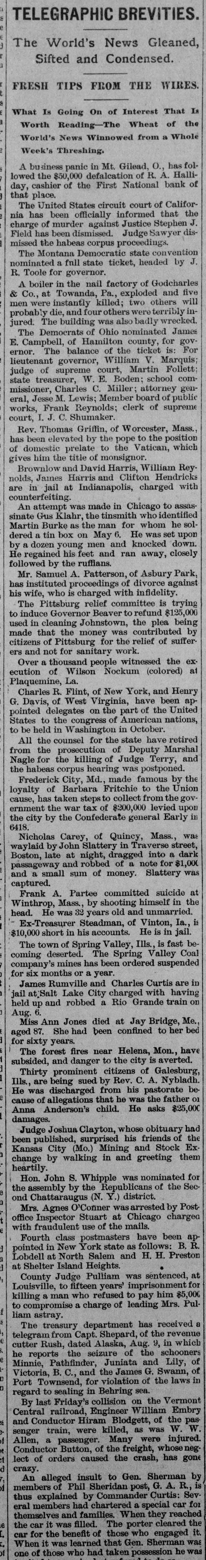 attention has been detected in a plot to blow up the prison, and a quantity Explosives have been found within the prison walls. Latimer was locked in a solitary dungeon at once on the discovery of the plot. For six weeks past the Warden suspected Latimer was laying some scheme and he has been watched closely. Last Friday a chore man was detected in getting a package near the north wall, which had been thrown over by an outsider during the night. A watchman got the package. It contained a quantity of Hercules powder. Warden Hatch has refused to state the details, and wants to keep the matter quiet SO he may catch Latimer's outside accomplice, and will not state what Latimer says about it. From reliable sourcess it is learned that old prisoners have made use of Latimer's money and secured outside influence to execute the scheme which would, if entirely successful, have partly destroyed the prison and let eight hundred convicts loose. Needs Investigation. ST. LOUIS, August 26th -The Post-Dispatch prints another chapter of its army exposure. It shows a terrible state of affairs at Jefferson Barracks, alleging that recruits are treated like dogs. Men are strung up by the wrists until they swoon from weakness. That brutal Sergeants deem no cruelty too severe. It relates how an insane man was heartlessly tortured, while common soldiers are imprisoned at the whim of their superiors. It is also charged in the expose that in the guardhouse where the prisoners are, they are packed into an inclosure twenty by forty feet. The sanitary condition is terrible. Lame Duck Annihilated. CINCINNATI, August 26:h.-About midnight the steamer Commonwealth came into direct collision with the small steamer Lame Duck opposite Newport. and utterly annihilated the latter. The crew were all saved. In less than one hour later the steamer Commonwealth was discovered on fire, and the flames could not be controlled. The steamer was burned to the water's edge. Loss, $40,000; fully insured. All lives were saved. Fifteen Per Cent. Short. NEW YORK, August 26:h.-When the result of the Vienna Congress became known on the floor of the Produce Exchange today there was considerable excitement. Grain went up 1 per cent. a bushel over Saturday's closing and 1½ cents over the lowest figure of the day. The market gradually settled and peace reigned before the close of day. The result of the Vienna Congress was startling. It showed the European grain crop was 15 per cent. short. Not Determined Yet. DEER PARK (Md.), August 26th.-President Harrison was seen to day at his cottage by an Associated Press representative. The President says he has made no announcement to any one as to the calling of an extra session of Congress. He says he has, of course, discussed the pros and cons of the matter with various persons. However, this much is understood, the question is not determined. Dishonest Cashier. MOUNT GILEAD (Ohio), August 26th.-It is supposed that the defalcations of Cashier Robert Halliday, of the First National Bank, which closed Saturday, will reach $25,000. Halliday on Friday made a confession to the Directors. He went away on Saturday. For the past five years he speculated in wheat and oil, used the bank's money and supplied its place with forged notes. Another Blanket Mortgage. NEW YORK, August 26th.-The Commercial Advertiser says a blanket mortgage for the Atchison, Topeka and Santa Fe Railroad, after the plan of the Northern Pacific, is now suggested as a possible solution of the present difficulty. The plan may be reported at the annual meeting of the stockholders on September 15:h. Construction Train Wrecked. LINCOLN (Neb.), August 26th.-The construction train on the northwestern extension of the Burlington and Missouri River road was wrecked Saturday night near Pine Ridge tunnel, near the northwestern corner of the State. Eleven men were hurt, two of whom, George Moore, the engineer, and James Murnan, a laborer, will probably die. Drunken Men Run Over. DURHAM (N. C), August 26th.-Last night a train on the Richmond and Danville Railroad ran over Arthur Burcham and Calvin Holder, near this city. Both men were drunk and lying on the track near the signal lights, at which the engineer was doubtless looking when the accident occurred. His Labors Ended. WEST LITTLETON (N. H.), August 26th.Colonel Alfred Aylward, formerly of the Transvaal Republic, died here yesterday. His life was full of adventure. He was prominent Fenian, and served in the American War of the Rebellion, also with Garibaldi and in the Boer campaign. Gone to Canada. CLEVELAND (Ohio), August 26th.-A. J. Jackson, of Cleveland, representative of Thomas Cook & Son, Tourist Agents of New York and London, is short $3,600 in his accounts. He has disappeared, and is supposed to have gone to Canada. Fatal Accident. SHANER (Pa.), August 26th -About three hundred feet of the Lake Shore Gas and Coal Company's trestle at Ciera fell this morning. Superintendent Weaser and his brother were fatally injured. Four other men areslightly hurt. All Hands Perished. NORFOLK (Va.), August 26th.-The schooner Joseph went ashore at Cape Henry in last night's gale, and is breaking up. The crew is missing. The schooner Maroon is also wrecked. It is believed all hands perished.
