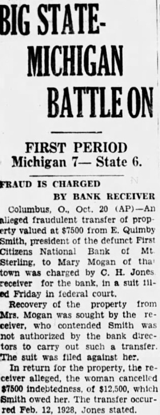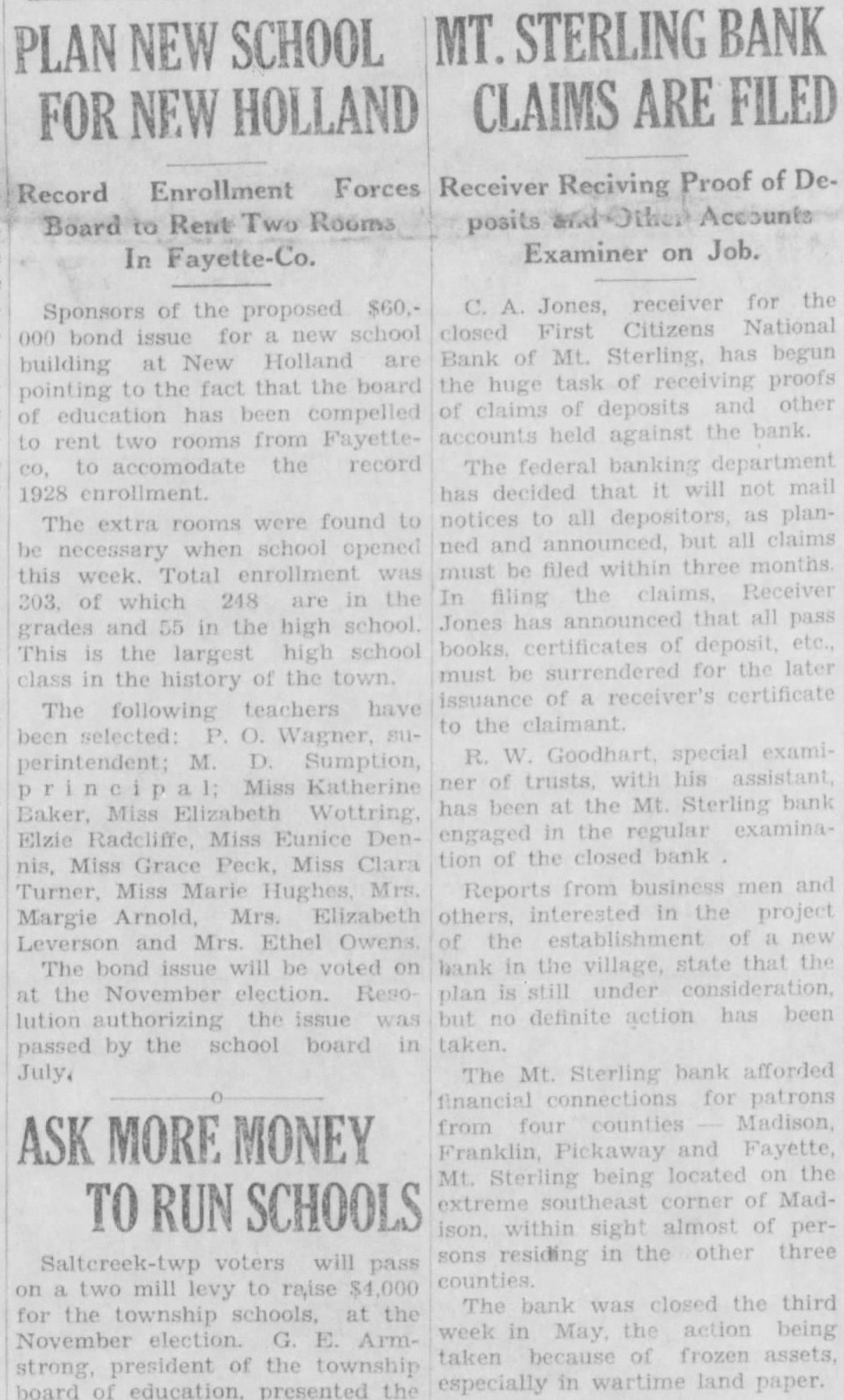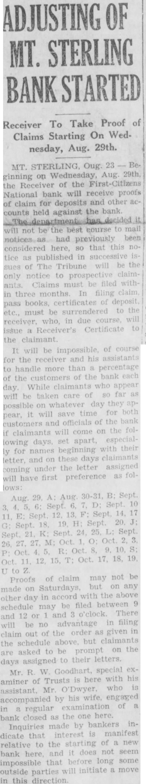 ADJUSTING OF MT. STERLING BANK STARTED Receiver To Take Proof of Claims Starting On Wednesday, Aug. 29th. MT. STERLING, Oug. 23 Beginning on Wednesday, Aug. 29th. the Receiver of the First-Citizens National bank will receive proofs of claim for deposits and other accounts held against the bank. decided not be the best course to mail had previously been considered here, so that this tice as published in successive of The will be the only notice to prospective claimants. Claims must filed in three months. In filing pass books, certificates of deposit must be surrendered to receiver. who, in due course, issue Receiver's Certificate to the claimant. It will be impossible, of course for the receiver and his assistants to handle more than a percentage of the customers of the bank day. While who appear will be taken care of so far whatever day they possible on pear, it will save time for customers and officials of the bank if claimants will come on the days, set apart, lowing ly for names beginning with their letter, and on these days claimants coming under the letter assigned will have first preference as lows: 30-31, B: Sept. Aug Aug. Sept 10 6: Sept. 17 E: 20. Sept. Sept. K: Sept 24, 25, L: Sept. 21. Oct. 27. M; Oct. Oct 10. R: Oct. 17, 18, Oct. to Proofs of claim may not be made Saturdays but on any day in accord with the above schedule may be filed between and 12 or and 3 o'clock. There will be no advantage in filing claim out of the order as given in the schedule above. but claimants asked to be prompt on the days assigned to their letters. Mr. R W Goodhart, special aminer of Trusts is here with assistant, Mr O'Dwyer, who is accompanied by his wife, engaged in a regular examination of bank closed as the one here. Inquiries made by bankers indicate that interest is manifest relative to the starting of new bank here, and it does not seem impossible that before long some outside parties initiate a in this direction.