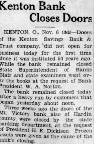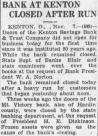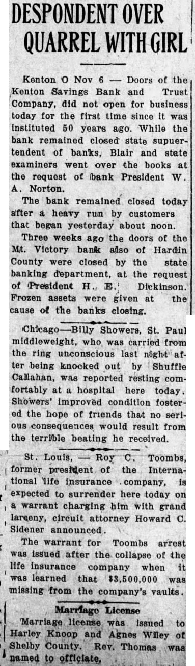 DESPONDENT OVER QUARREL WITH GIRL Kenton o Nov 6 - Doors of the Kenton Savings Bank and Trust Company, did not open for business today for the first time since it was instituted 50 years ago. While the bank remained closed state supuertendent of banks, Blair and state examiners went over the books at the request of bank President W. A. Norton. The bank remained closed today after a heavy run by customers that began yesterday about noon. Three weeks ago the doors of the Mt. Victory bank also of Hardin County were closed by the state banking department, at the request of President H., E. Dickinson. Frozen assets were given at the cause of the banks closing. Chicago-Billy Showers, St. Paul middleweight, who was carried from the ring unconscious last night after being knooked out by Shuffle Callahan, was reported resting comfortably at a hospital here today. Showers' improved condition fostered the hope of friends that no serious consequences would result from the terrible beating he received. St. Louis, Roy C. Toombs, former president of the International life insurance company, is expected to surrender here today on a warrant charging him with grand largeny, circuit attorney Howard C. Sidener announced. The warrant for Toombs arrest was issued after the collapse of the life insurance company when it was learned that $3,500,000 was missing from the company's vaults. Marriage License Marriage license was issued to Harley Knoop and Agnes Willey of Shelby County. Rev. Thomas was named to officiate,