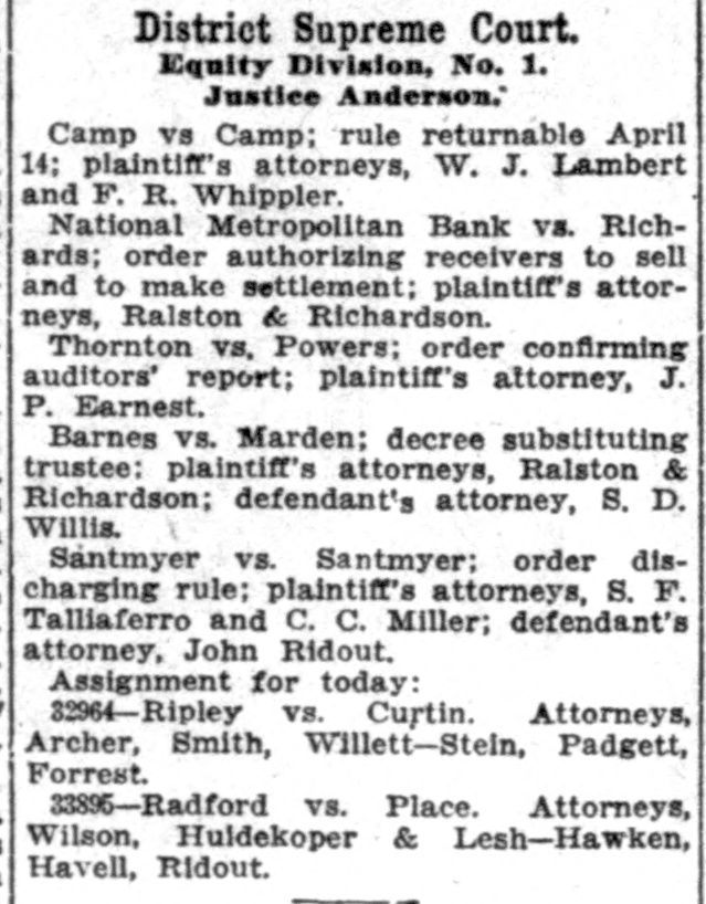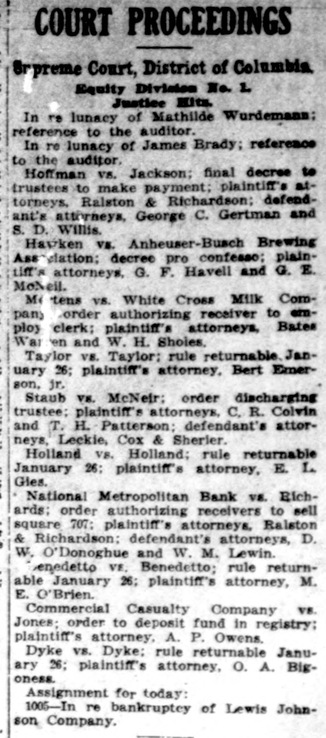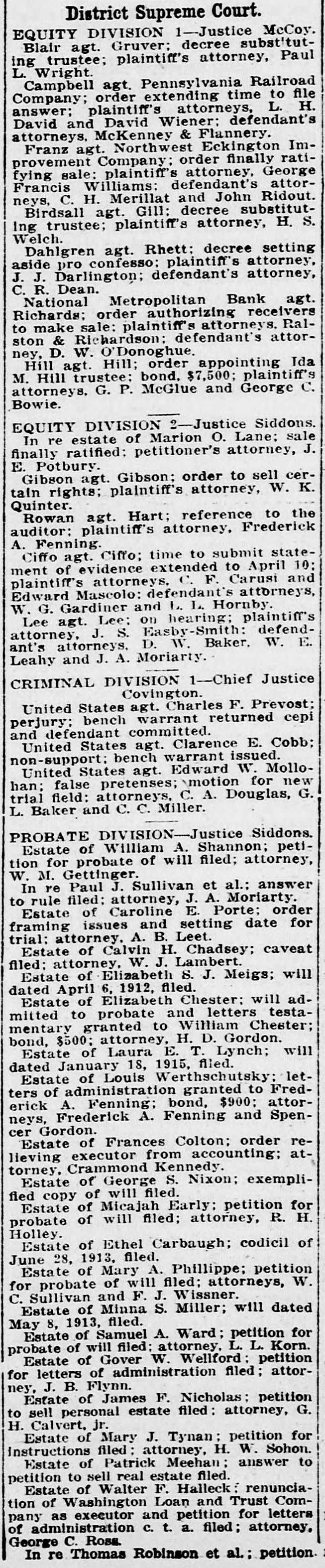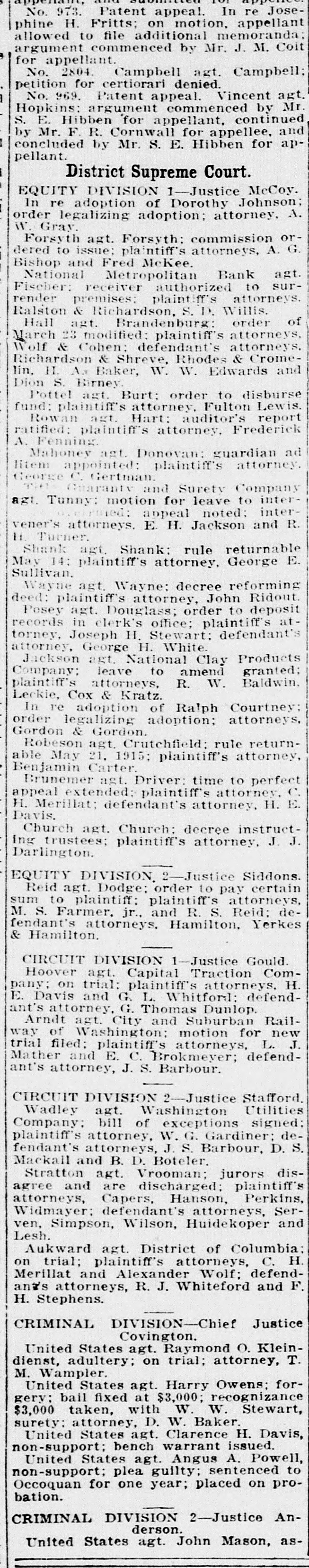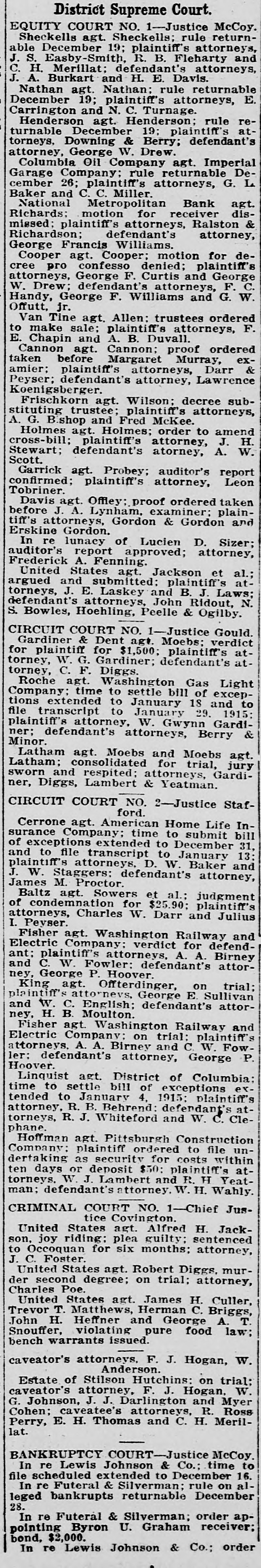 District Supreme Court. EQUITY COURT NO. 1-Justice McCoy. Sheckells agt. Sheckells; rule returnable December 19; plaintiff's attorneys, J. S. Easby-Smith, R. B. Fleharty and C. H. Merillat: defendant's attorneys, J. A. Burkart and H. E. Davis. Nathan agt. Nathan; rule returnable December 19; plaintiff's attorneys, E. Carrington and N. C. Turnage. Henderson agt. Henderson: rule returnable December 19; plaintiff's attorneys, Downing & Berry; defendant's attorney, George W. Drew. Columbia Oil Company agt. Imperial Garage Company: rule returnable December 26; plaintiff's attorneys, G. L Baker and C. C. Miller. National Metropolitan Bank agt. Richards: motion for receiver dismissed: plaintiff's attorneys, Ralston & Richardson; defendant's attorney, George Francis Williams. Cooper agt. Cooper; motion for decree pro confesso denied; plaintiff's attorneys, George F. Curtis and George W. Drew: defendant's attorneys, F. C. Handy, George F. Williams and G. W. Offutt, jr. Van Tine agt. Allen: trustees ordered to make sale: plaintiff's attorneys, F. E. Chapin and A. B. Duvall. Cannon agt. Cannon: proof ordered taken before Margaret Murray, examier: plaintiff's attorneys, Darr & Peyser; defendant's attorney, Lawrence Koenigsberger. Frischkorn agt. Wilson; decree substituting trustee; plaintiff's attorneys, A. G. Bishop and Fred McKee. Holmes agt. Holmes; order to amend cross-bill; plaintiff's attorney, J. H. Stewart; defendant's atorney, A. W. Scott. Garrick agt. Probey; auditor's report confirmed; plaintiff's attorney, Leon Tobriner. Davis agt. Offley: proof ordered taken before J. A. Lynham, examiner: plaintiff's attorneys, Gordon & Gordon and Erskine Gordon. In re lunacy of Lucien D. Sizer: auditor's report approved; attorney, Frederick A. Fenning. United States agt. Jackson et al.; argued and submitted: plaintiff's attorneys, J. E. Laskey and B. J. Laws: defendant's attorneys, John Ridout, N. S. Bowles, Hoehling, Peelle & Ogilby. CIRCUIT COURT NO. 1-Justice Gould. Gardiner & Dent agt. Moebs: verdict for plaintiff for $1,500; plaintiff's attorney, W. G. Gardiner; defendant's attorney, C. F. Diggs. Roche agt. Washington Gas Light Company: time to settle bill of exceptions extended to January 18 and to file transcript to January 29. 1915: plaintiff's attorney, W. Gwynn GardiMinor. ner; defendant's attorneys, Berry & Latham agt. Moebs and Moebs agt. Latham: consolidated for trial, jury sworn and respited: attorneys, Gardiner, Diggs, Lambert & Yeatman. CIRCUIT COURT NO. 2-Justice Stafford. Cerrone agt. American Home Life Insurance Company; time to submit bill of exceptions extended to December 31, and to file transcript to January 13: plaintiff's attorneys, D. W. Baker and J. W. Staggers: defendant's attorney, James M. Proctor. Baltz agt. Sowers et al.: judgment of condemnation for $25.90: plaintiff's attorneys, Charles W. Darr and Julius I. Peyser. Fisher agt. Washington Railway and Electric Company: verdict for defendant; plaintiff's attorneys. A. A. Birney and C. W. Fowler: defendant's attorney, George P. Hoover. King agt. Offterdinger, on trial: plaintiff's attorneys, George E. Sullivan and W. C. English: defendant's attorney, H. B. Moulton. Fisher agt. Washington Railway and Electric Company: on trial: plaintiff's attorneys. A. A. Birney and C. W. Fowler: defendant's attorney, George P. Hoover. Linquist agt. District of Columbia: time to settle bill of exceptions extended to January 4, 1915: plaintiff's attorney. R. B. Behrend: defendant's attorneys, R. J. Whiteford and W. C. Clephane. Hoffman agt. Pittsburgh Construction Company: plaintiff ordered to file undertaking as security for costs within ten days or deposit $50: plaintiff's attorneys. W. J. Lambert and R. H Yeatman; defendant's attorney. W. H. Wahly. CRIMINAL COURT NO. 1-Chief Justice Covington. United States agt. Alfred H. Jackson, joy riding: plea guilty: sentenced to Occoquan for six months; attorney, J. C. Foster. United States agt. Robert Diggs, murder second degree; on trial: attorney, Charles Poe. United States agt. James H. Culler, Trevor T. Matthews, Herman C. Briggs, John H. Heffner and George A. T. Snouffer, violating pure food law; bench warrants issued. caveator's attorneys, F. J. Hogan, W. Anderson. Estate of Stilson Hutchins: on trial: caveator's attorney, F. J. Hogan, W. G. Johnson, J. J. Darlington and Myer Cohen; caveatee's attorneys, R. Ross Perry, E. H. Thomas and C. H. Merillat. BANKRUPTCY COURT-Justice McCoy. In re Lewis Johnson & Co.; time to file scheduled extended to December 16. In re Futeral & Silverman; rule on alleged bankrupts returnable December 28. In re Futeral & Silverman; order appointing Byron U. Graham receiver; bond, $2,000. In re Lewis Johnson & Co.; order